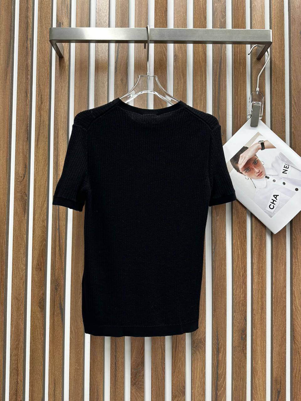 Футболка Chanel LUX-105443 – это образец элегантности и утонченности. Черная футболка в рубчик с круглым вырезом и короткими рукавами, украшенными пуговицами. На груди расположен маленький карман с логотипом бренда. Футболка идеально подходит для создания стильных и комфортных образов.