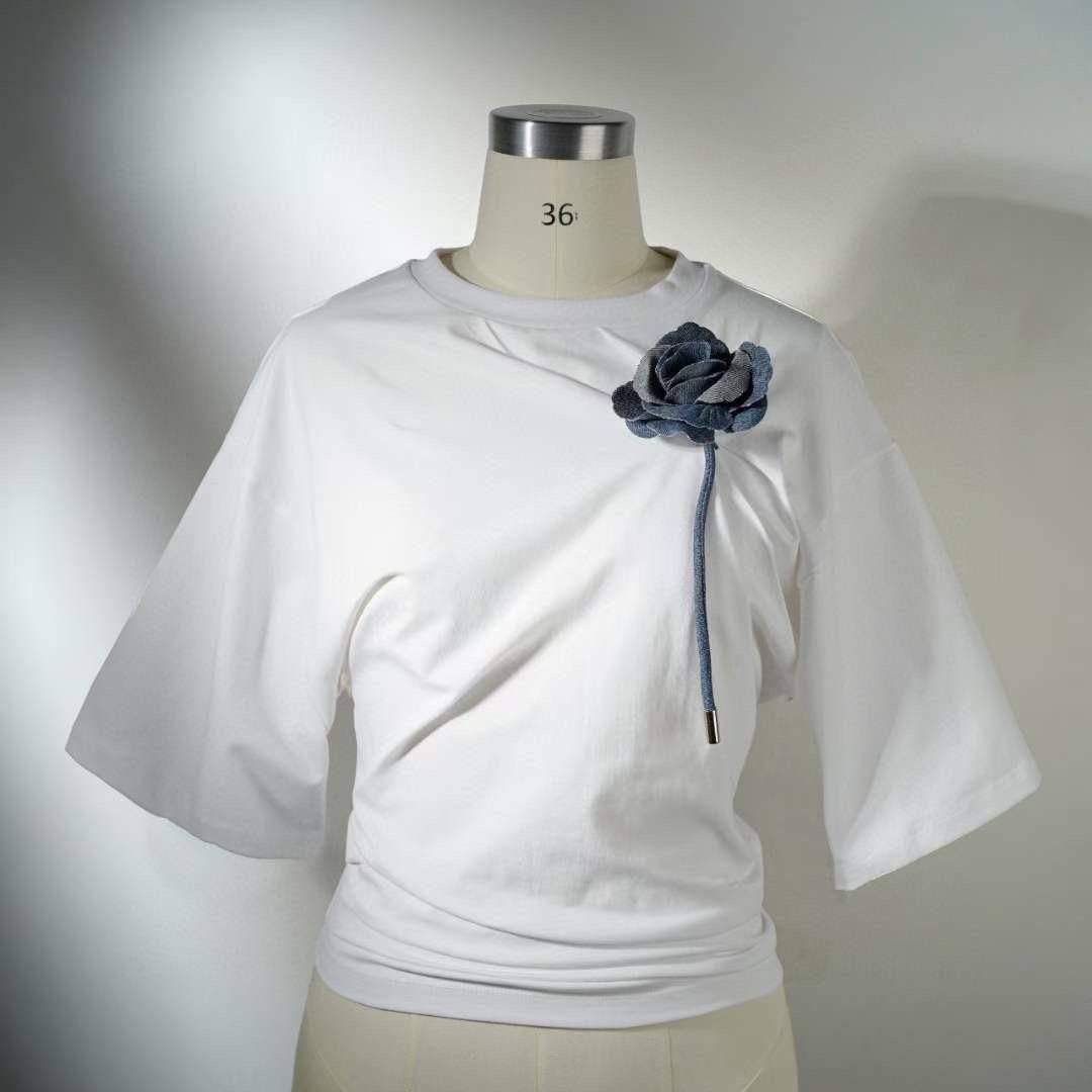 Футболка Chanel LUX-105491 - это стильный предмет гардероба, представленный в классическом белом цвете. Футболка выполнена в свободном стиле с укороченным рукавом, что придает ей современный и элегантный вид. Декоративный элемент в виде цветка добавляет изюминку и индивидуальность изделию.