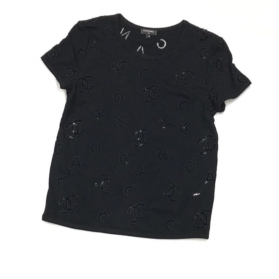 Черная женская футболка Chanel LUX-25300 - это стильный предмет гардероба, сочетающий классический крой с элегантными деталями. Футболка украшена повторяющимся принтом в виде логотипа бренда и букв, выполненных с использованием пайеток, что придает ей особый шик. Она идеально подходит для создания как повседневных, так и более изысканных образов.