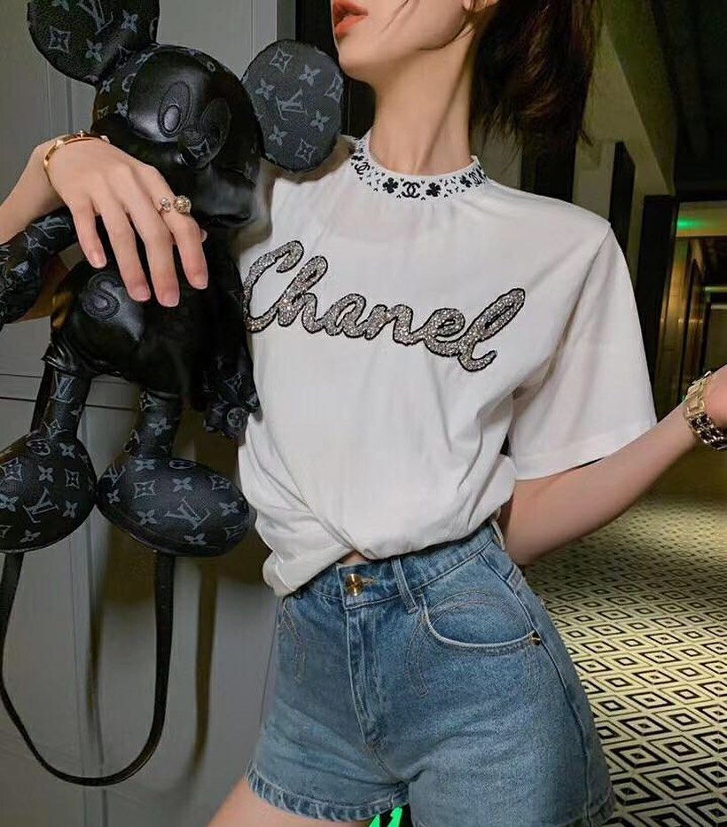 Футболка женская Chanel LUX-30983 – это стильная и элегантная модель, которая прекрасно дополнит ваш повседневный или вечерний образ. Дизайн футболки выполнен в классическом стиле, но с акцентом на роскошные детали, подчеркивающие статус бренда. Декоративный принт в виде логотипа Chanel, выполненный из сверкающих камней, делает эту футболку по-настоящему особенной.