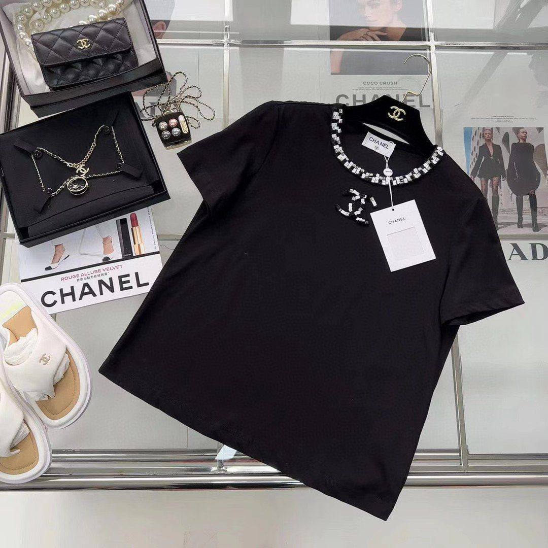 Футболка женская Chanel LUX-88667 — это элегантный предмет гардероба от известного бренда. Черная футболка с круглым вырезом украшена декором на вороте и логотипом бренда. Этот элемент одежды идеально подойдет для создания стильных и запоминающихся образов.