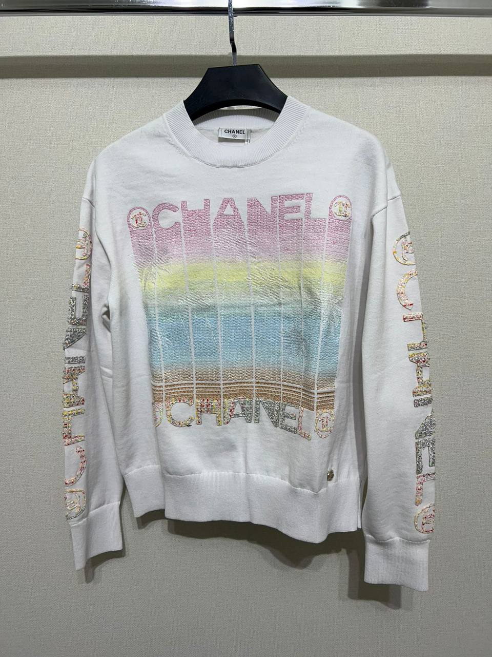 Худи Chanel LUX-103065 - это стильная белая толстовка с ярким дизайном. Она выполнена в спортивном стиле и украшена логотипом бренда на груди, а также надписями на рукавах. Худи отлично подойдет для создания повседневных образов.