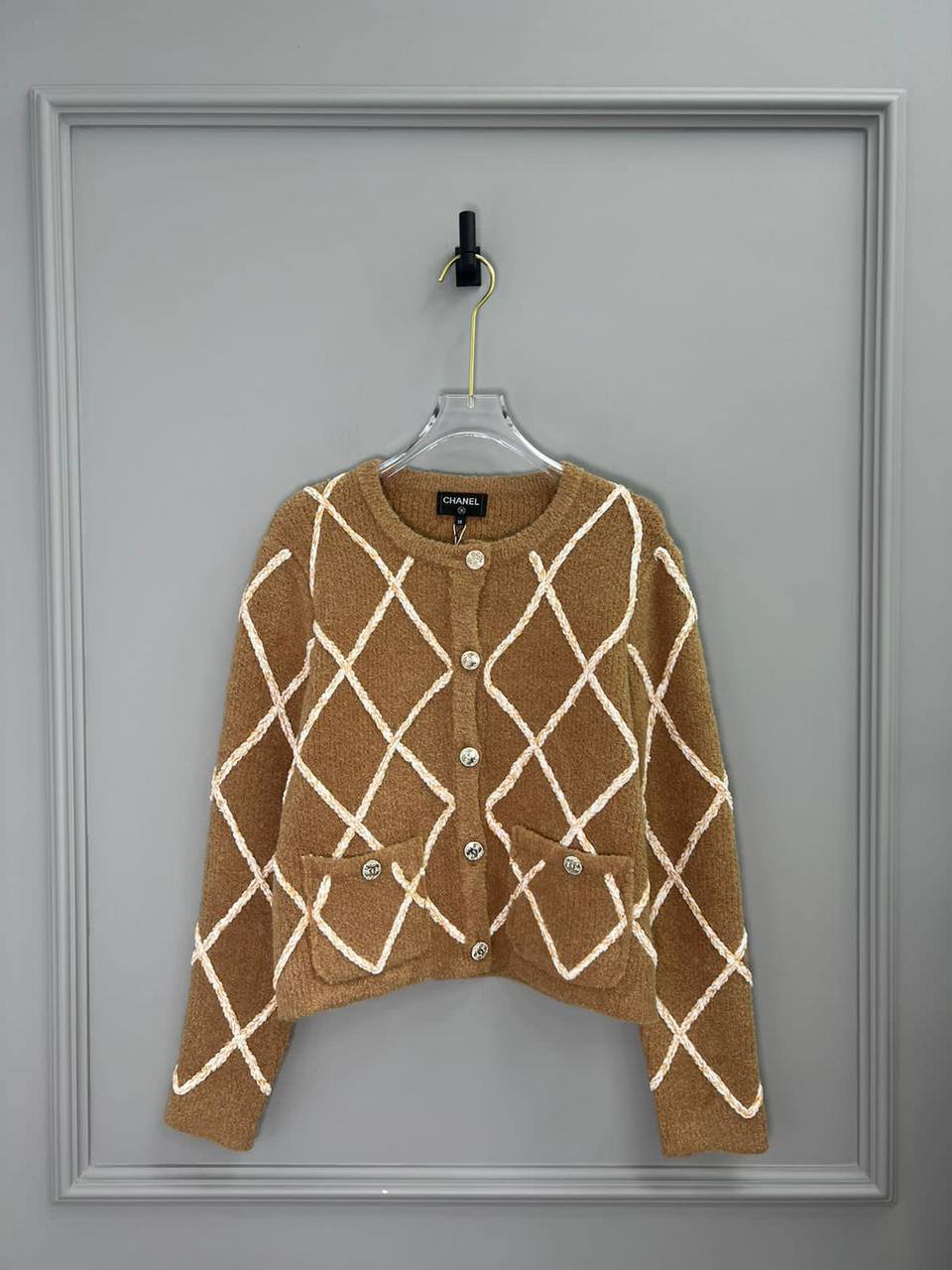Кардиган Chanel LUX-99733 представляет собой воплощение элегантности и стиля. Кардиган выполнен в теплых коричневых тонах с кремовым узором в виде ромбов, придающим ему изысканный вид. Классический дизайн с круглым вырезом и накладными карманами делает его идеальным дополнением к любому образу.
