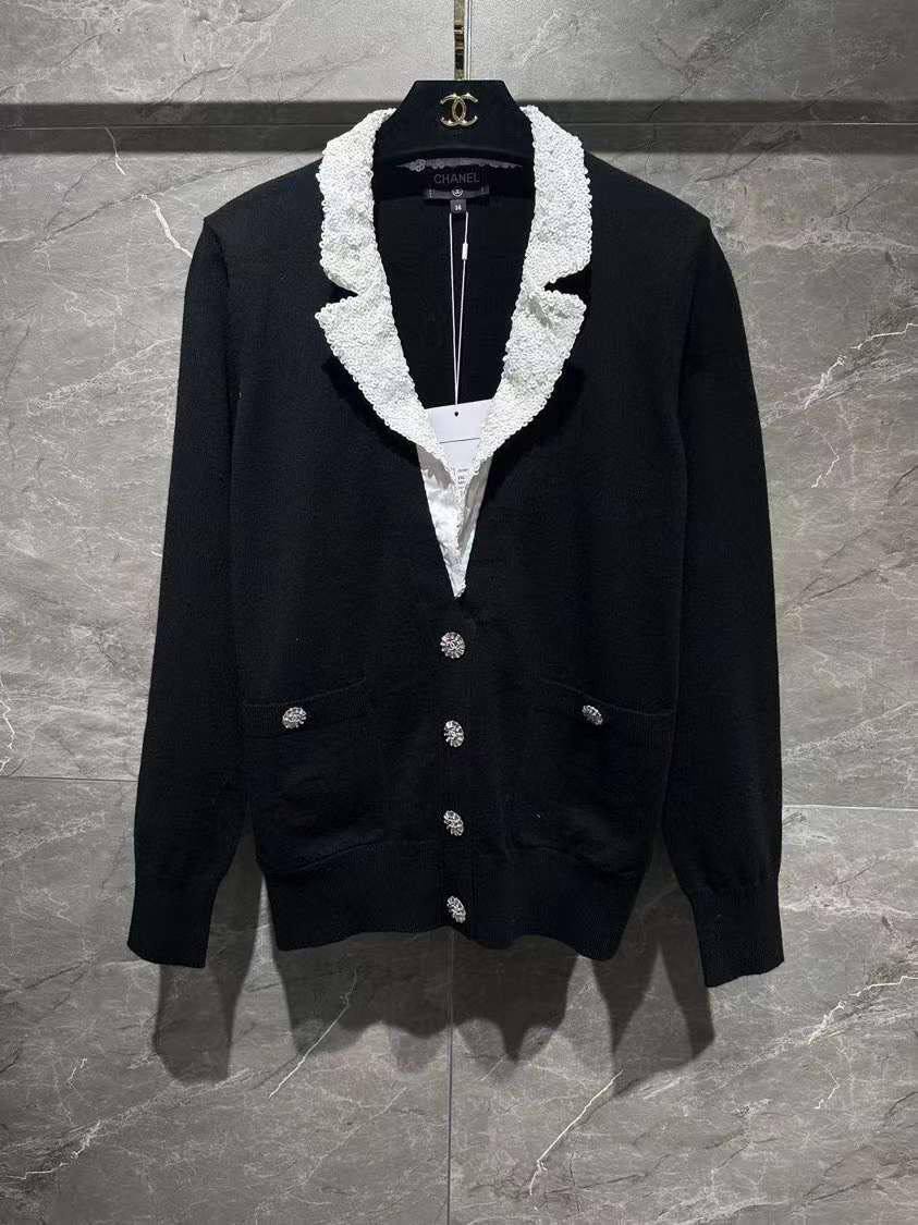 Кардиган Chanel LUX-97592 — это элегантный кардиган в классическом стиле. Основной цвет — черный, с контрастным белым воротником. Застегивается на крупные пуговицы с декоративными элементами.