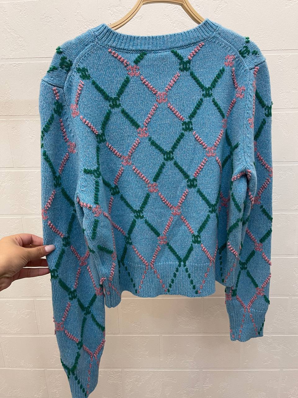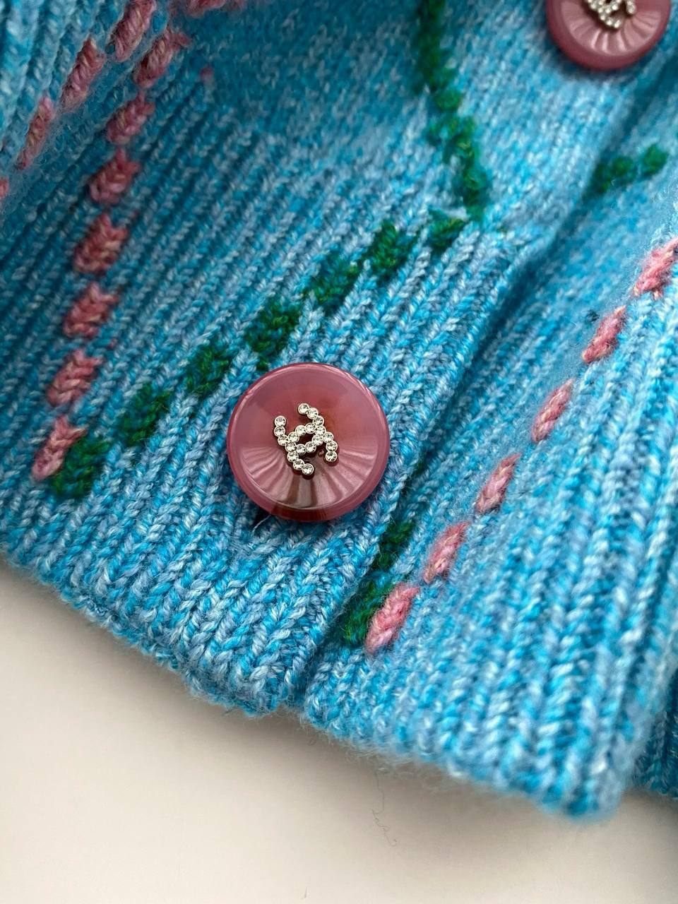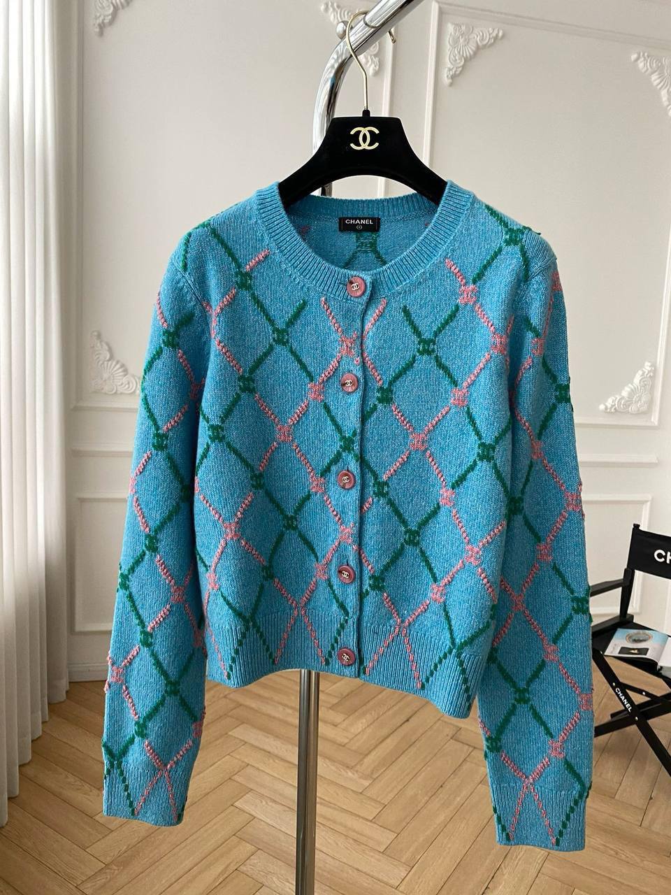 Кардиган Chanel LUX-110177 представляет собой воплощение элегантности и стиля. Кардиган выполнен в ярком бирюзовом цвете с ромбовидным узором, сочетающим в себе розовые и зеленые элементы, создавая уникальный и запоминающийся образ. Этот кардиган станет прекрасным дополнением к любому гардеробу, подчеркивая индивидуальность и изысканный вкус своей обладательницы.