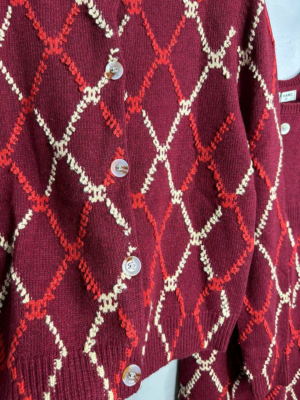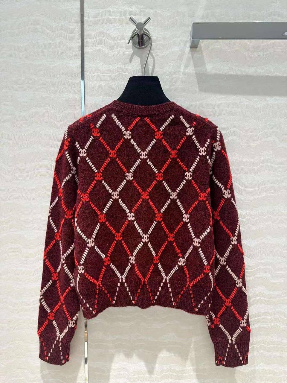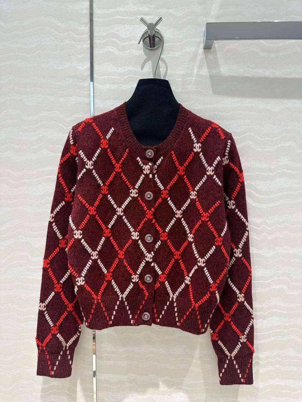 Кардиган Chanel LUX-111085 - это воплощение элегантности и утонченности в стиле модного дома Chanel. Кардиган бордового цвета с ромбовидным узором, выполненным в красных и белых оттенках. Классический крой и фирменная фурнитура добавляют изделию изысканности и делают его идеальным выбором для создания стильных образов.