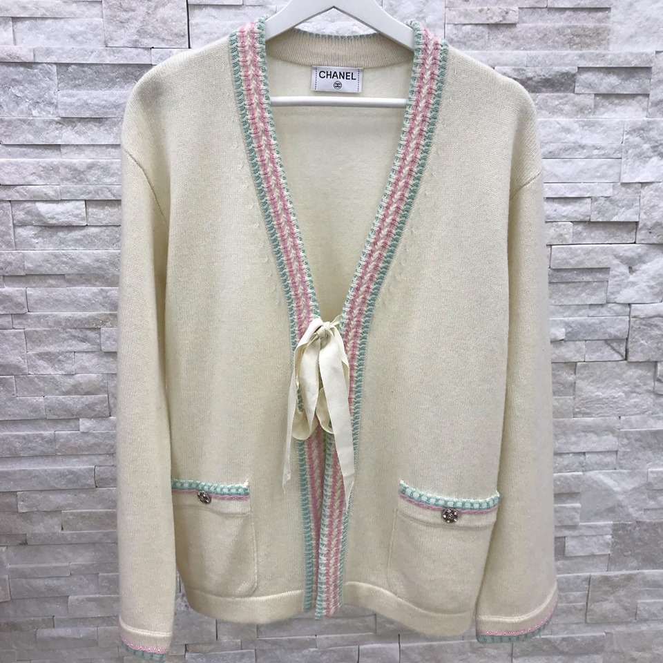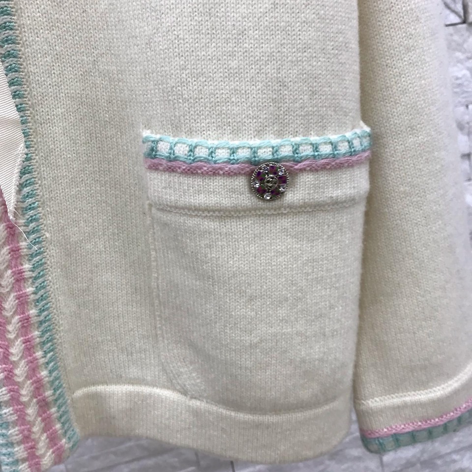 Этот кардиган Chanel LUX-21192 представляет собой элегантное дополнение к женскому гардеробу, выполненное в узнаваемом стиле модного дома. Светлый, кремовый оттенок кардигана подчеркивается нежными полосами розового и мятного цветов, обрамляющими V-образный вырез и накладные карманы. Застежка в виде атласного банта добавляет изделию изысканности и романтичности.