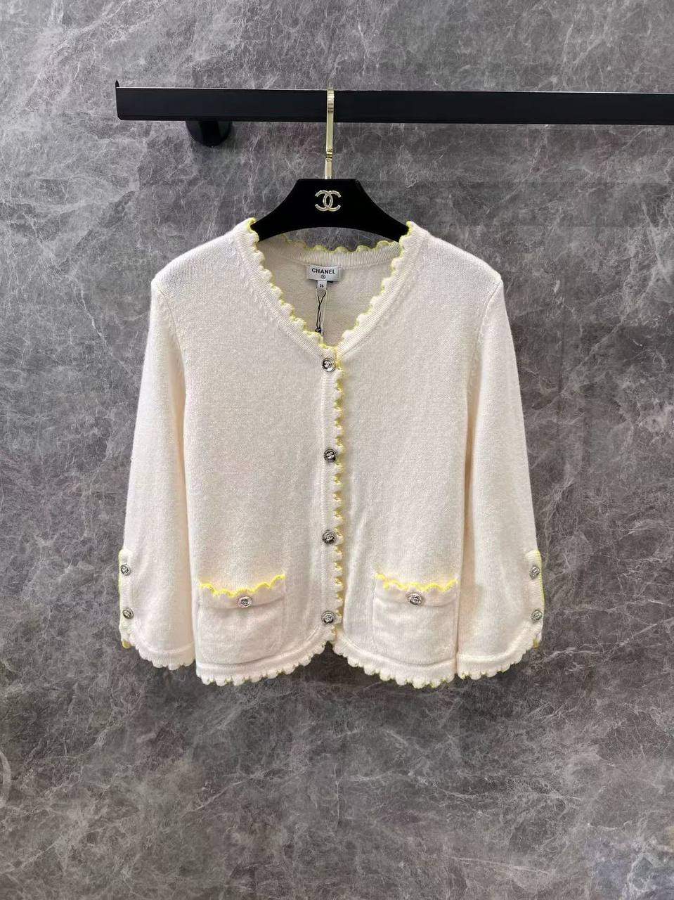 Кардиган Chanel LUX-116263 — это элегантный предмет гардероба в классическом стиле от Chanel. Кардиган выполнен в кремовом оттенке с отделкой ярко-желтого цвета по краям, карманам и манжетам. Он имеет V-образный вырез, пуговицы с логотипом бренда и два передних кармана.