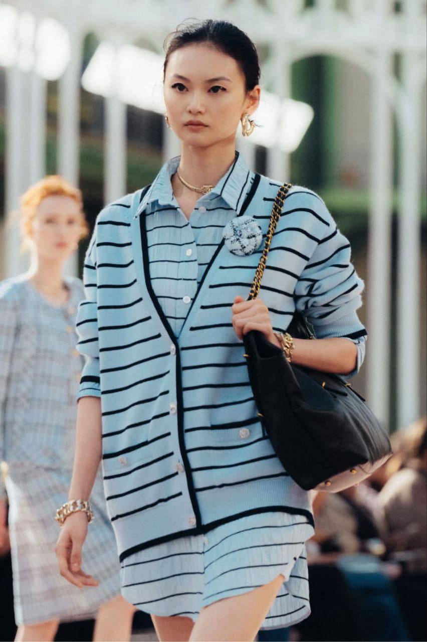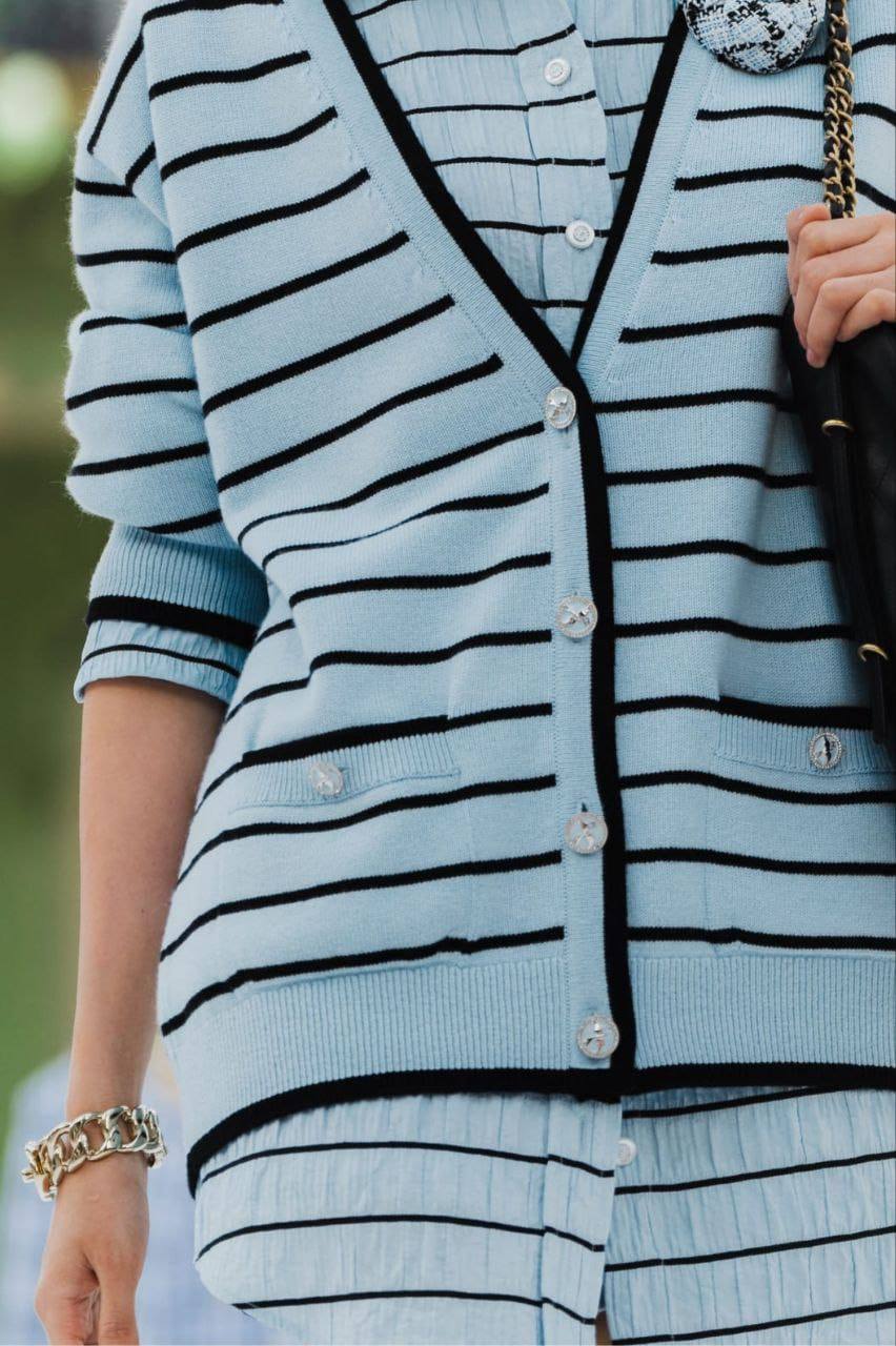 Кардиган Chanel LUX-120065 — воплощение элегантности и стиля. Кардиган в полоску выполнен в светло-голубом цвете с черными полосами, добавляет образу свежести и легкости. Идеально подходит для создания стильных образов.