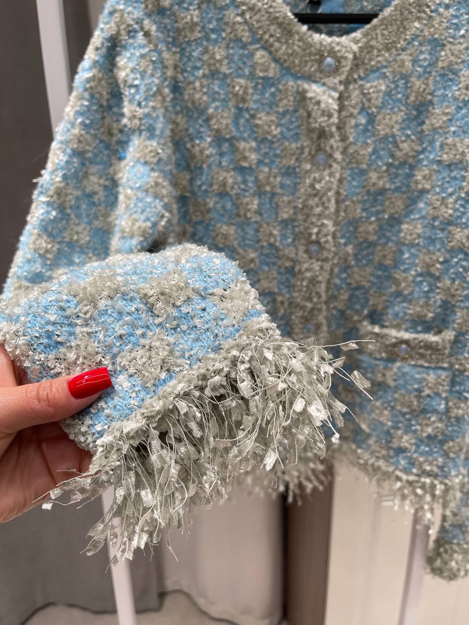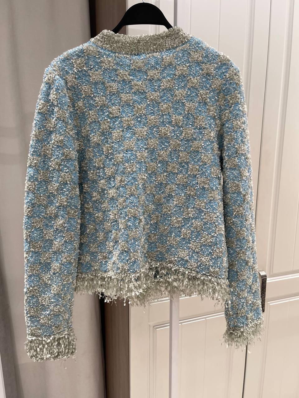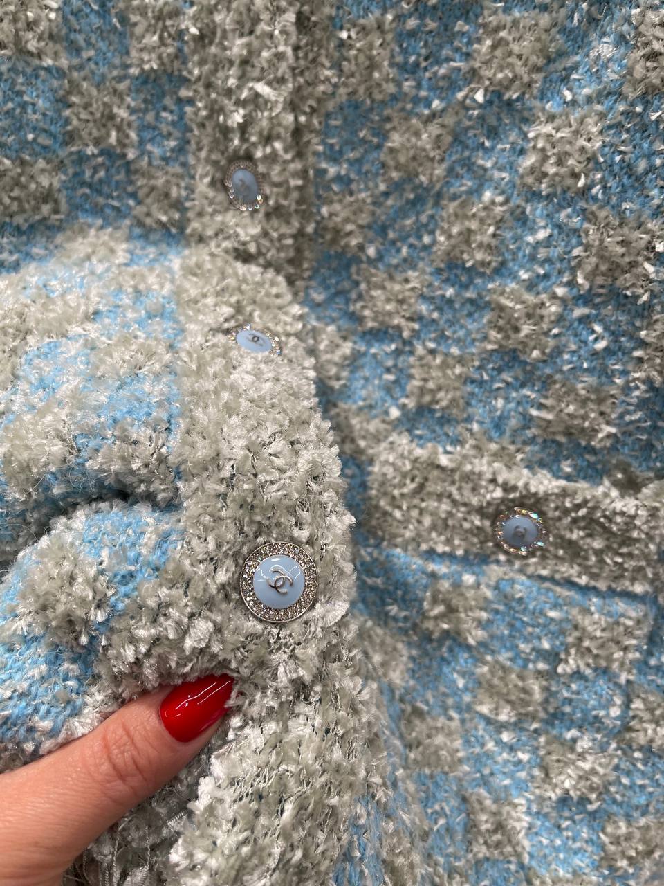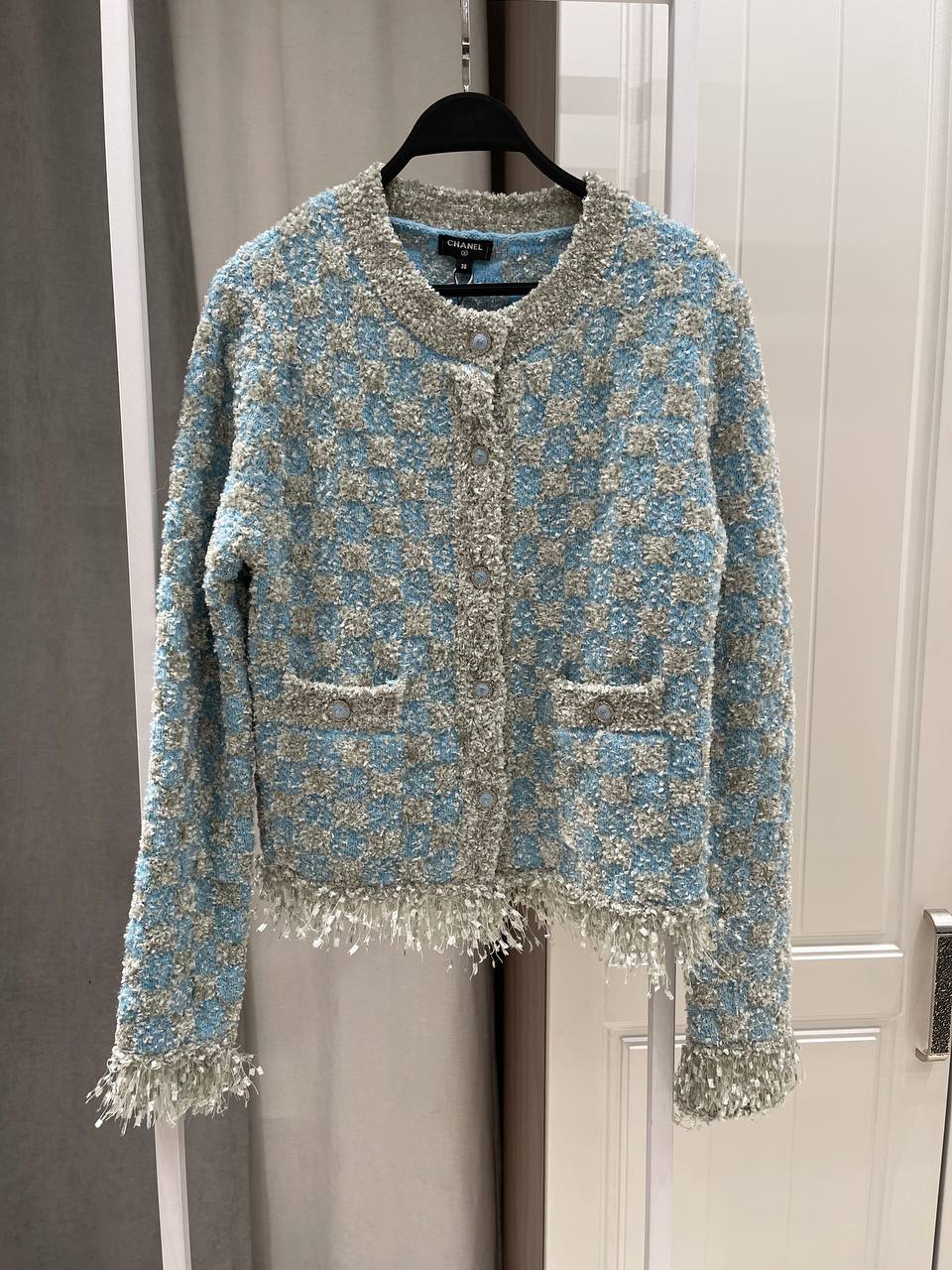 Изысканный женский кардиган Chanel LUX-128933 в стиле "твид" станет прекрасным дополнением к вашему гардеробу. Модель выполнена в нежных голубых и серых тонах, что добавляет ей элегантности и шарма.