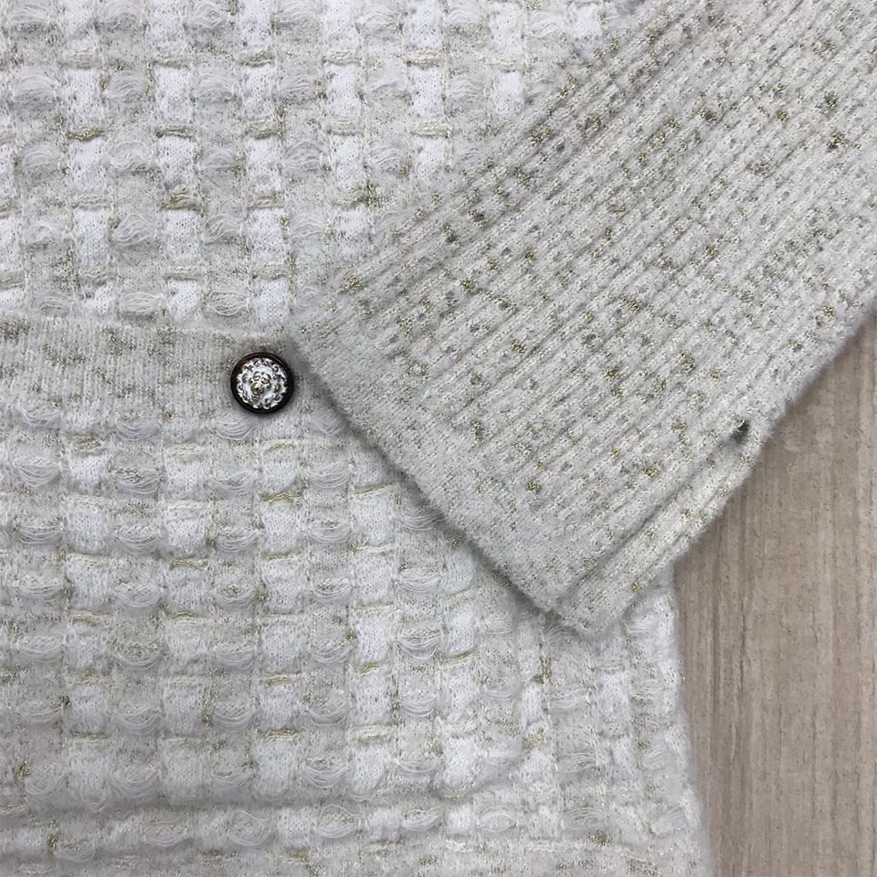 Этот элегантный кардиган Chanel LUX-23735 выполнен в классическом стиле, идеально подходящем для создания утонченных образов. Его фактурная вязка и минималистичный дизайн делают его универсальным элементом гардероба. Кардиган декорирован эффектными пуговицами, что добавляет изделию изысканности.