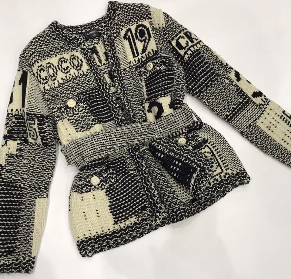 Кардиган Chanel LUX-26814 представляет собой стильное трикотажное изделие, выполненное в узнаваемом стиле бренда. Дизайн кардигана отличается эффектным черно-белым принтом, включающим элементы с надписями "COCO" и числовыми мотивами, что придает ему уникальный и запоминающийся вид. Модель дополнена поясом, подчеркивающим талию, и накладными карманами, добавляя функциональности и элегантности.