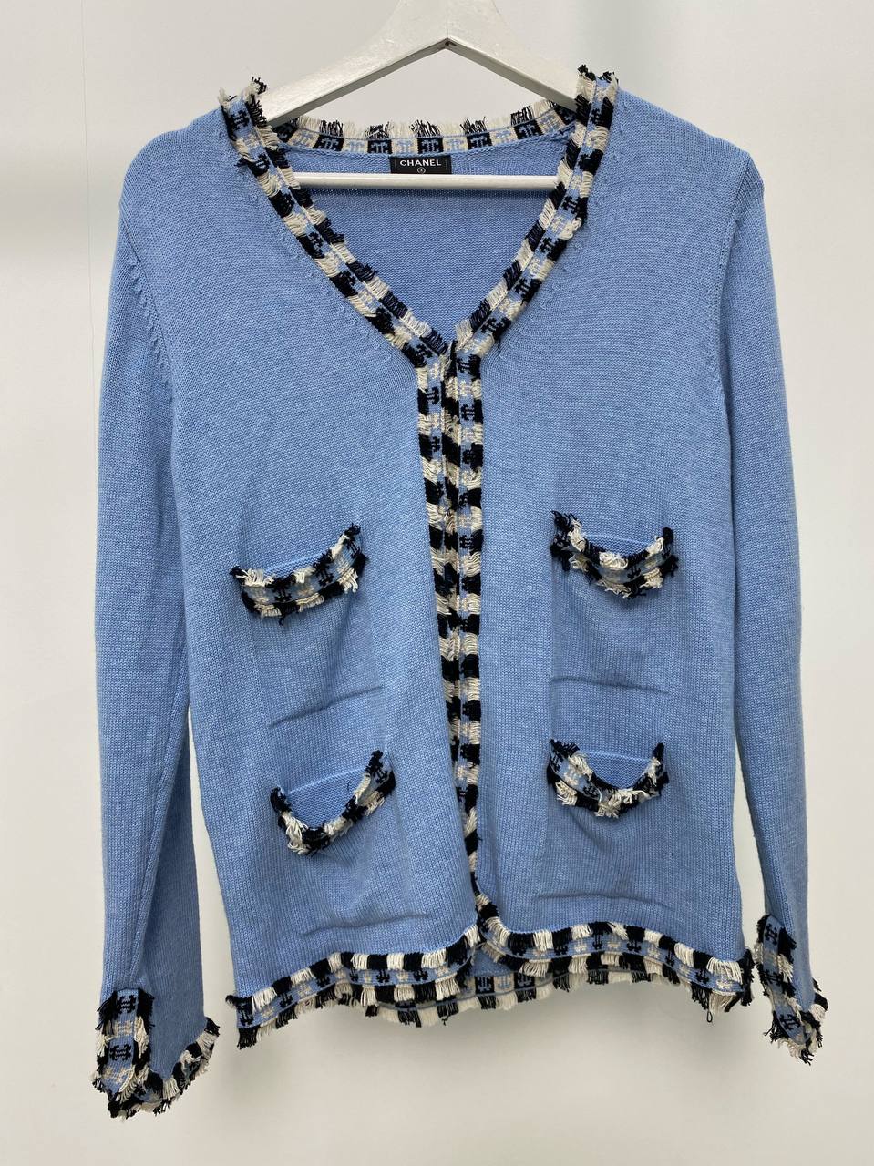 Этот женский кардиган Chanel LUX-53327 выполнен в нежном голубом цвете, сочетая классический крой с актуальными деталями. Элегантный дизайн подчеркнут контрастной отделкой в черно-белую клетку и бахромой по краям, а также декоративными накладными карманами. Такой кардиган станет изысканным дополнением к вашему гардеробу, придавая образу утонченность и стиль.