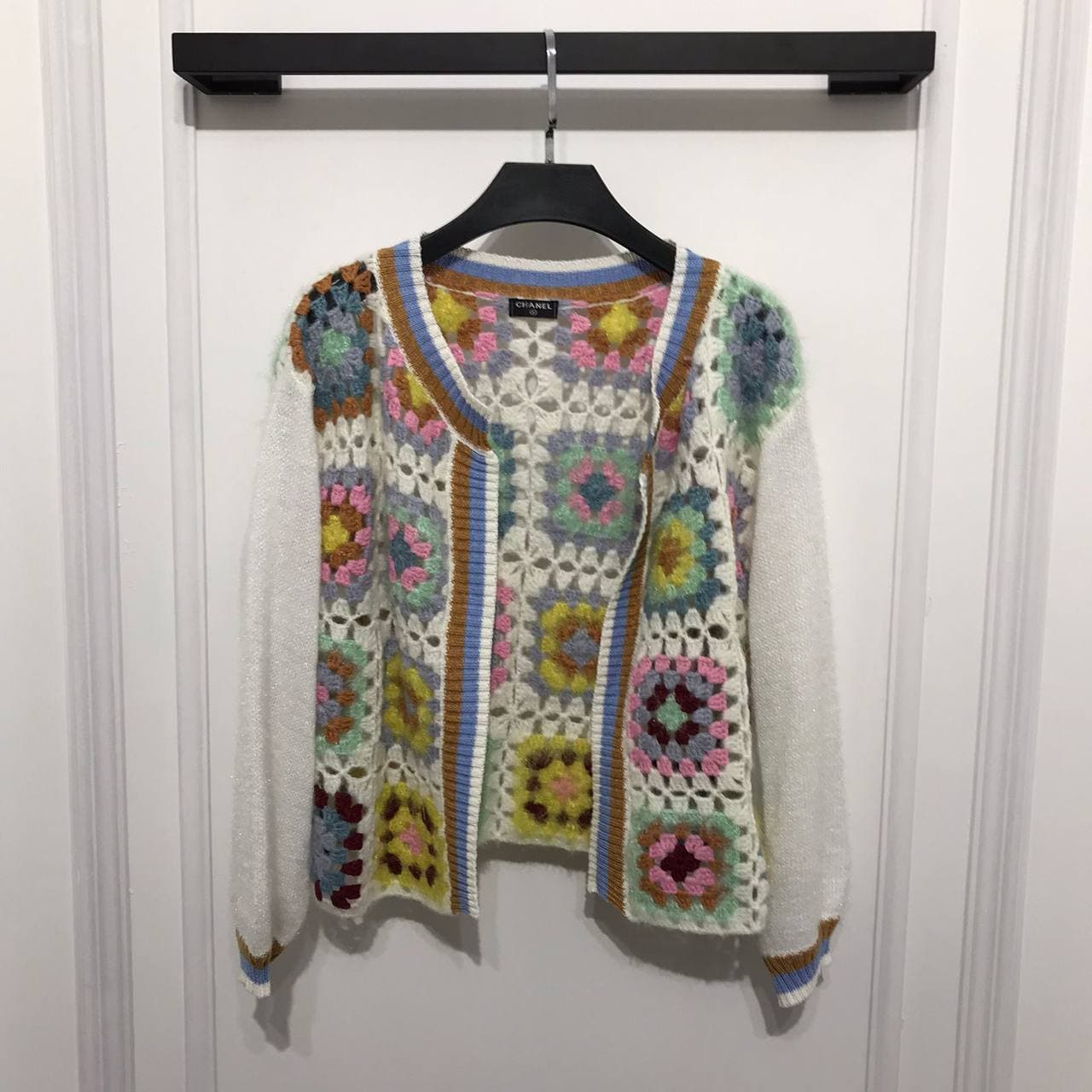 Кардиган Chanel LUX-59947 — это яркое воплощение богемного стиля с элементами ручной работы. Изделие выполнено в технике вязания крючком, сочетая в себе крупные квадратные мотивы "бабушкин квадрат" в разнообразной цветовой гамме с гладкими белыми рукавами. Этот кардиган станет акцентной деталью вашего образа, добавляя ему индивидуальности и шарма.
