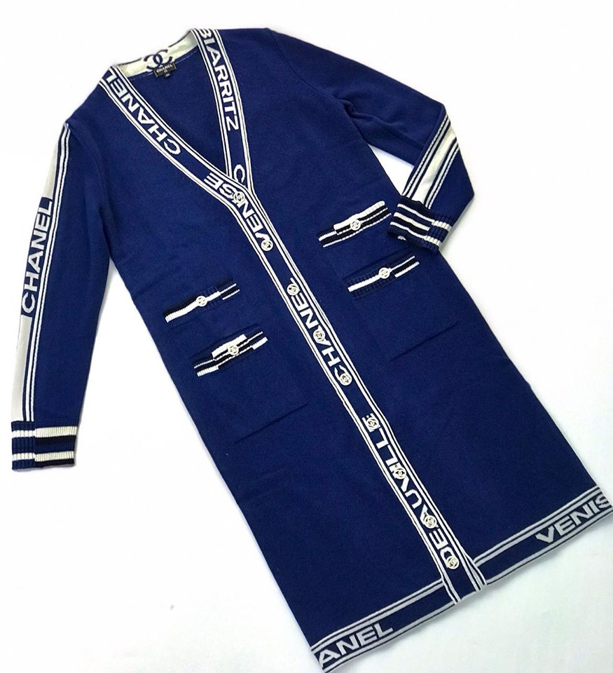 Кардиган Chanel LUX-17264 – это элегантный и стильный предмет женской одежды, выполненный в классическом темно-синем цвете. Дизайн кардигана украшен контрастной белой отделкой с надписями "CHANEL" и названиями курортных городов, что придает ему узнаваемый фирменный стиль. Этот кардиган идеально подходит для создания утонченных и модных образов.