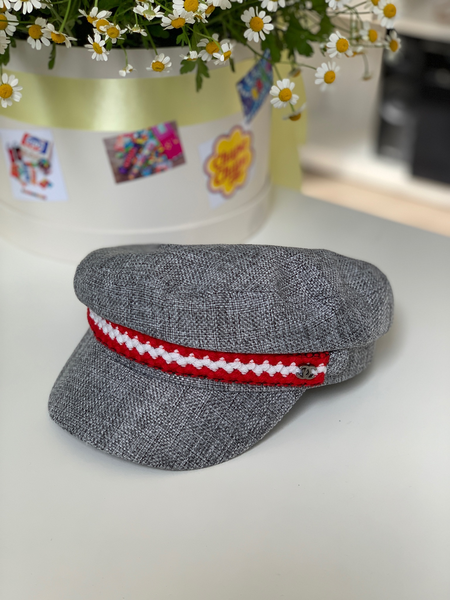 Стильное кепи Chanel LUX-15250 выполнено в классическом дизайне, который подойдет как для повседневного образа, так и для создания более изысканных комплектов. Декоративная полоса с красно-белым узором придает головному убору изысканность и узнаваемый стиль.
