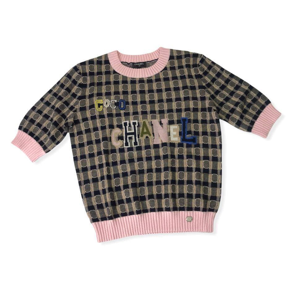 Эта кофта Chanel LUX-56395 представляет собой стильное трикотажное изделие с интересным геометрическим принтом и контрастными розовыми манжетами и воротом. На груди кофты выделяется аппликация с названием бренда "CHANEL" и надписью "COCO", выполненная разноцветными буквами. Модель идеально подойдет для создания элегантных повседневных образов.