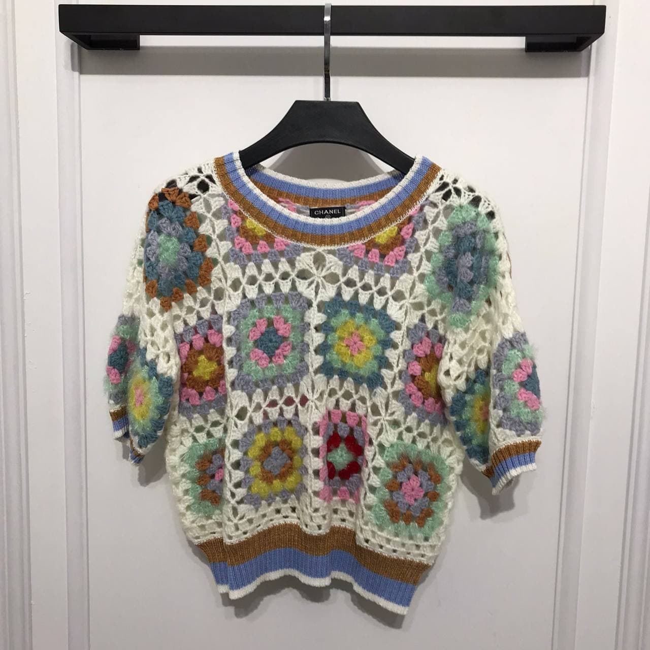 Кофта Chanel LUX-59948 представляет собой яркий вязаный топ в стиле бохо. Изделие выполнено в технике кроше, состоящей из разноцветных квадратных мотивов, напоминающих бабушкин квадрат, на фоне белой ажурной вязки. Многоцветие пряжи, включающее пастельные и яркие оттенки, придает модели летнее и непринужденное настроение.