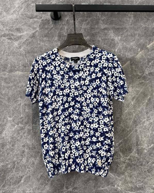 Кофта Chanel LUX-110549 представляет собой стильную кофту с короткими рукавами и круглым вырезом. Она выполнена в темно-синем цвете с белым цветочным принтом. Этот элемент гардероба может быть использован для создания как повседневных, так и более элегантных образов, подчеркивая индивидуальность и изысканный вкус.