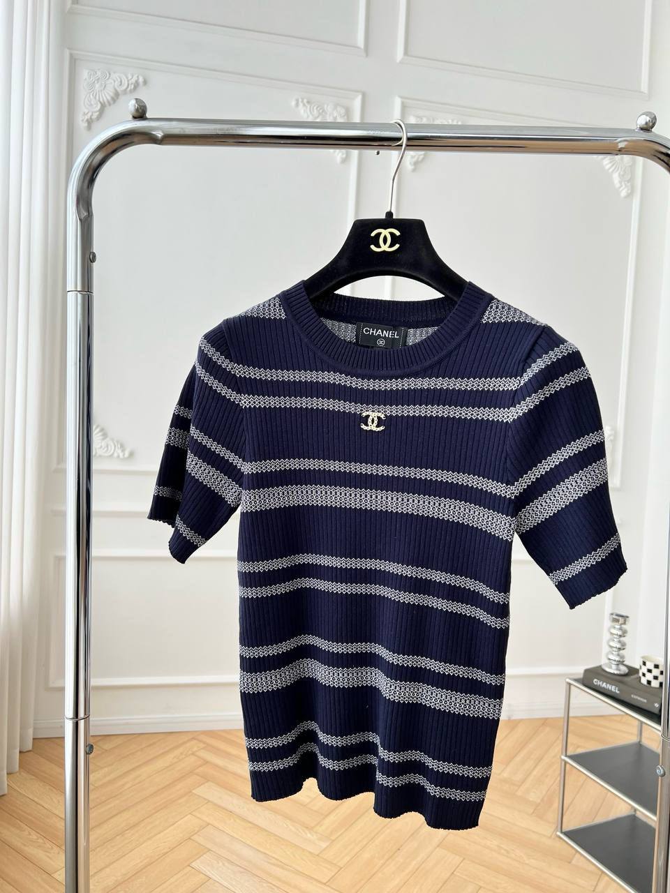 Кофта Chanel LUX-117304 — элегантная трикотажная кофта, сочетающая в себе классический стиль и современный дизайн. Изделие выполнено в темно-синем цвете с контрастными белыми полосами, что придает ему свежий и актуальный вид. Кофта идеально подойдет для создания как повседневных, так и более нарядных образов.