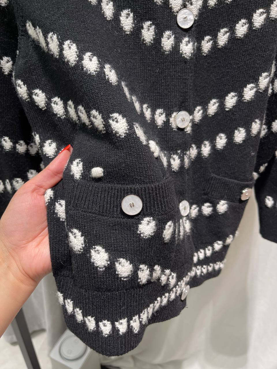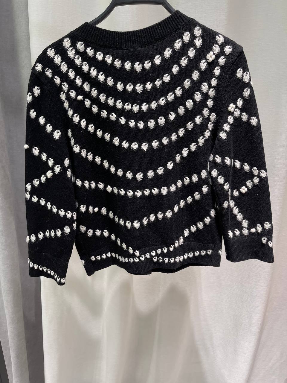 Кофта Chanel LUX-118677 представляет собой стильный кардиган, сочетающий в себе элегантность и современность. Чёрный цвет основы дополнен белым декоративным узором, создавая выразительный контраст. Эта кофта идеально подходит для создания утонченных образов.