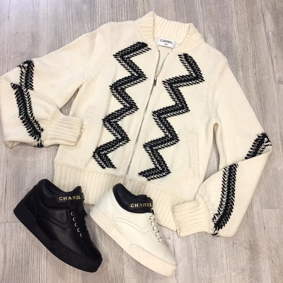 Эта женская кофта Chanel LUX-17568 представляет собой стильное решение для современного гардероба. Модель выполнена в кремовом цвете с выразительным черным зигзагообразным узором на передней части и вдоль рукавов, придающим ей динамичный и узнаваемый вид. Дизайн кофты напоминает спортивную бомберную куртку, дополненную молнией по центру и удобными боковыми карманами.