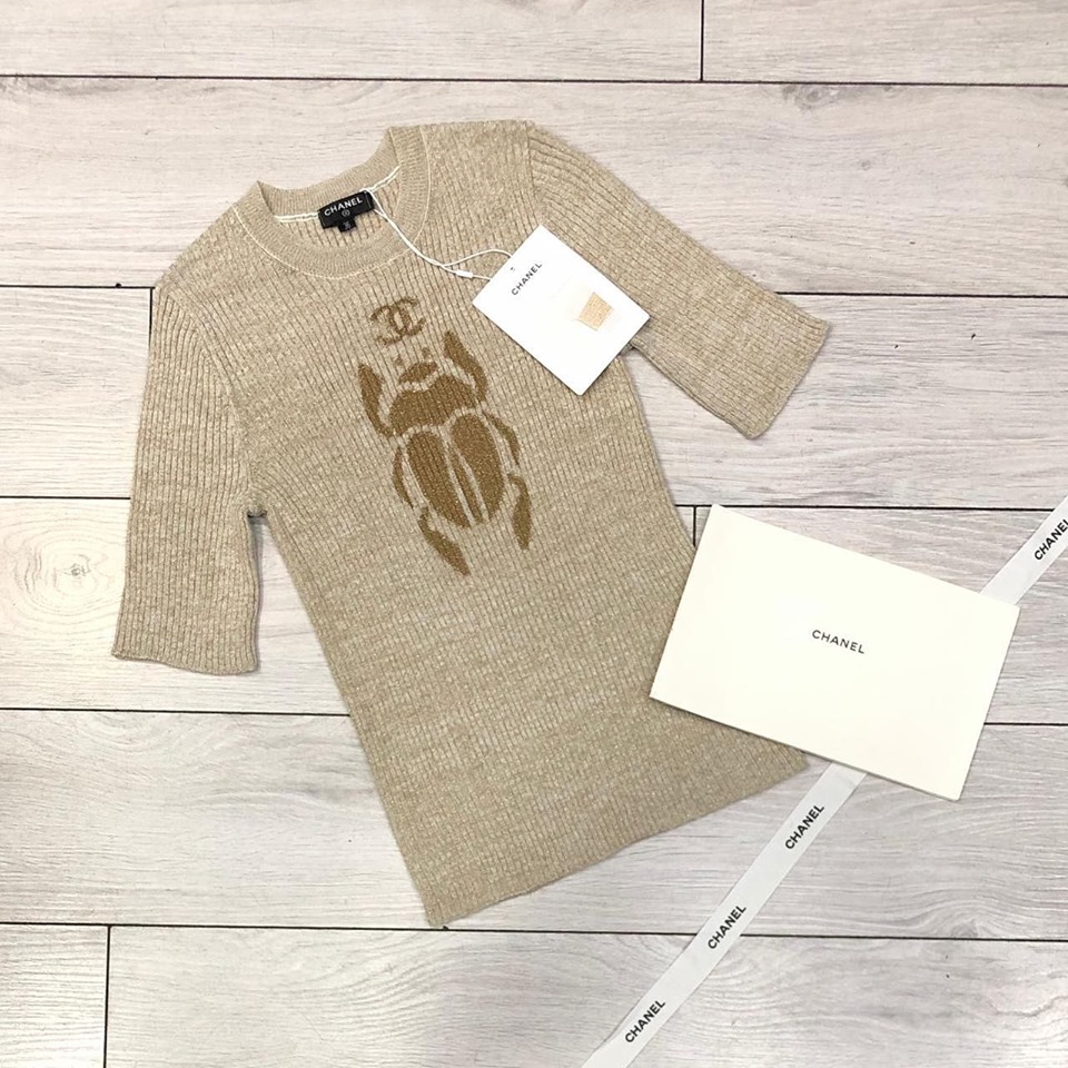 Кофта женская Chanel LUX-18842 представляет собой элегантный и стильный элемент гардероба. Выполненная в бежевом цвете, она украшена выразительным принтом в виде жука и логотипа бренда, что подчеркивает ее эксклюзивность. Кофта имеет полуприлегающий силуэт и короткие рукава, что делает ее универсальной для различных образов.