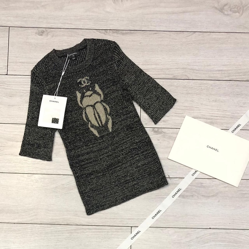 Эта женская кофта Chanel LUX-18843 представляет собой стильный трикотажный пуловер с оригинальным принтом. Изделие выполнено в темно-серой меланжевой расцветке, украшенное контрастным изображением жука-скарабея, выполненного в бежевых тонах, и логотипом бренда. Кофта имеет укороченный рукав три четверти и круглый вырез горловины, что придает ей современный и элегантный вид.