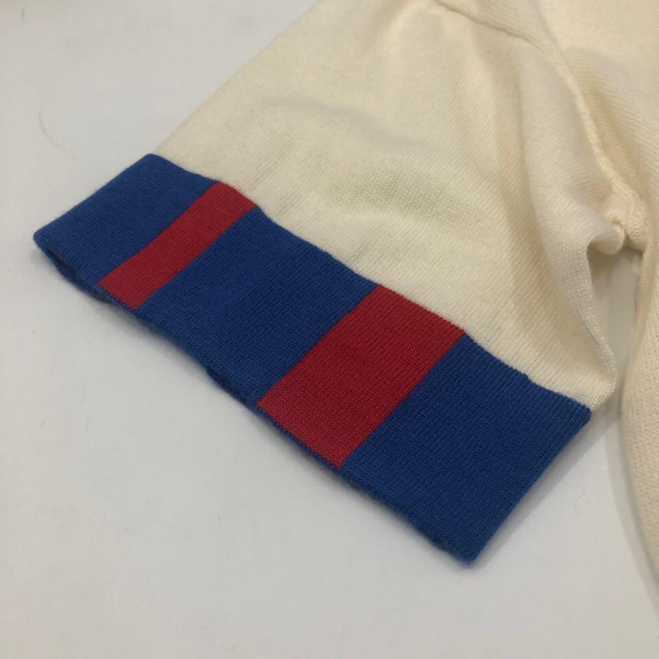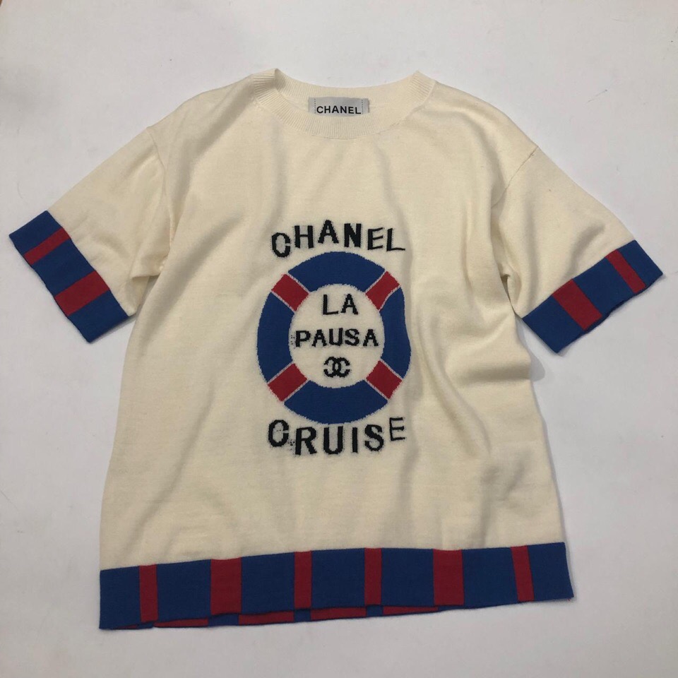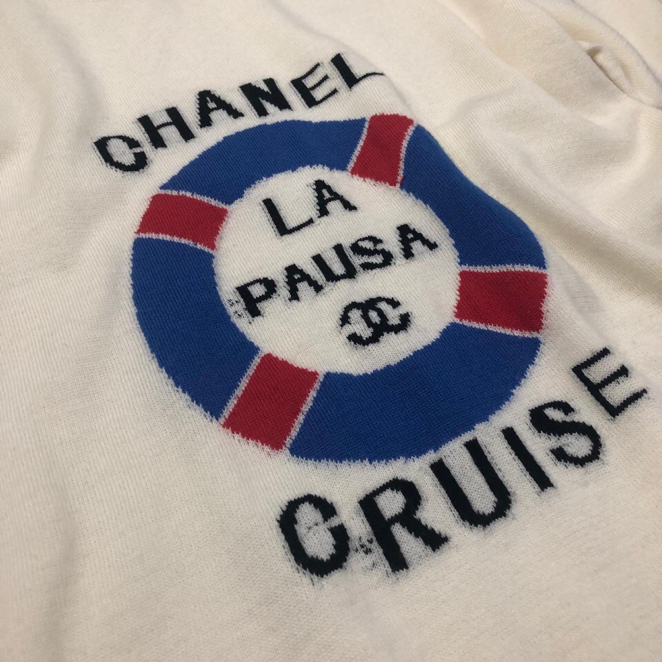 Эта женская кофта Chanel ОДЖ-1074 выполнена в кремовом цвете и имеет короткие рукава, украшенные сине-красными полосами. На груди расположена яркая аппликация в виде спасательного круга с надписями "CHANEL", "LA PAUSA", "CRUISE" и логотипом бренда, что придает изделию спортивный и морской стиль. Нижняя часть кофты также отделана сине-красной полосой, гармонируя с рукавами.