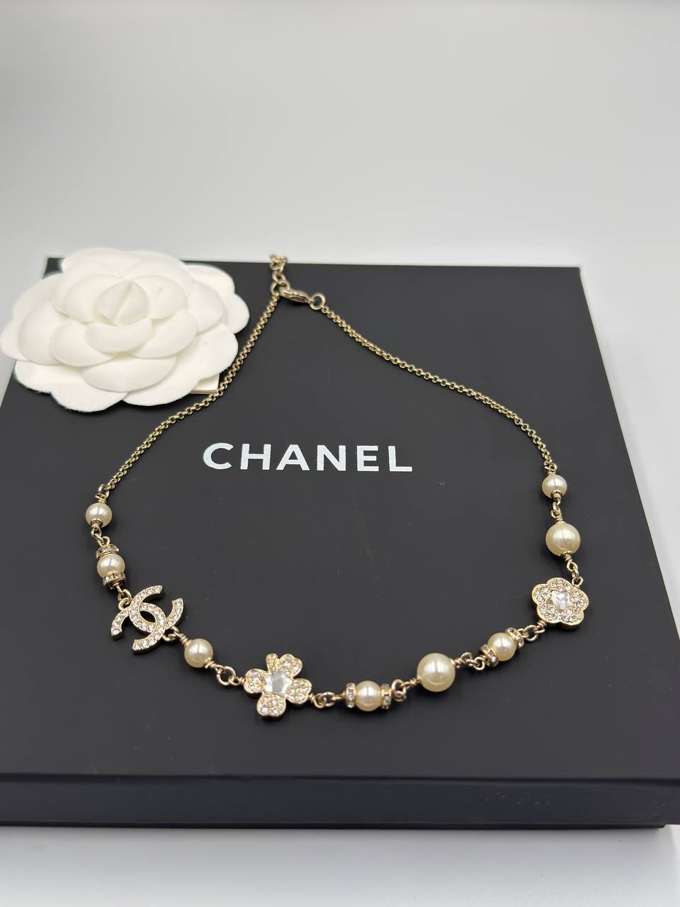 Колье Chanel LUX-120106 — это изысканное украшение, выполненное в классическом стиле бренда. Колье выполнено в золотистом оттенке, украшено жемчужинами и декоративными элементами в форме логотипа и цветов, инкрустированных кристаллами. Оно подойдет для добавления элегантности в любой образ.