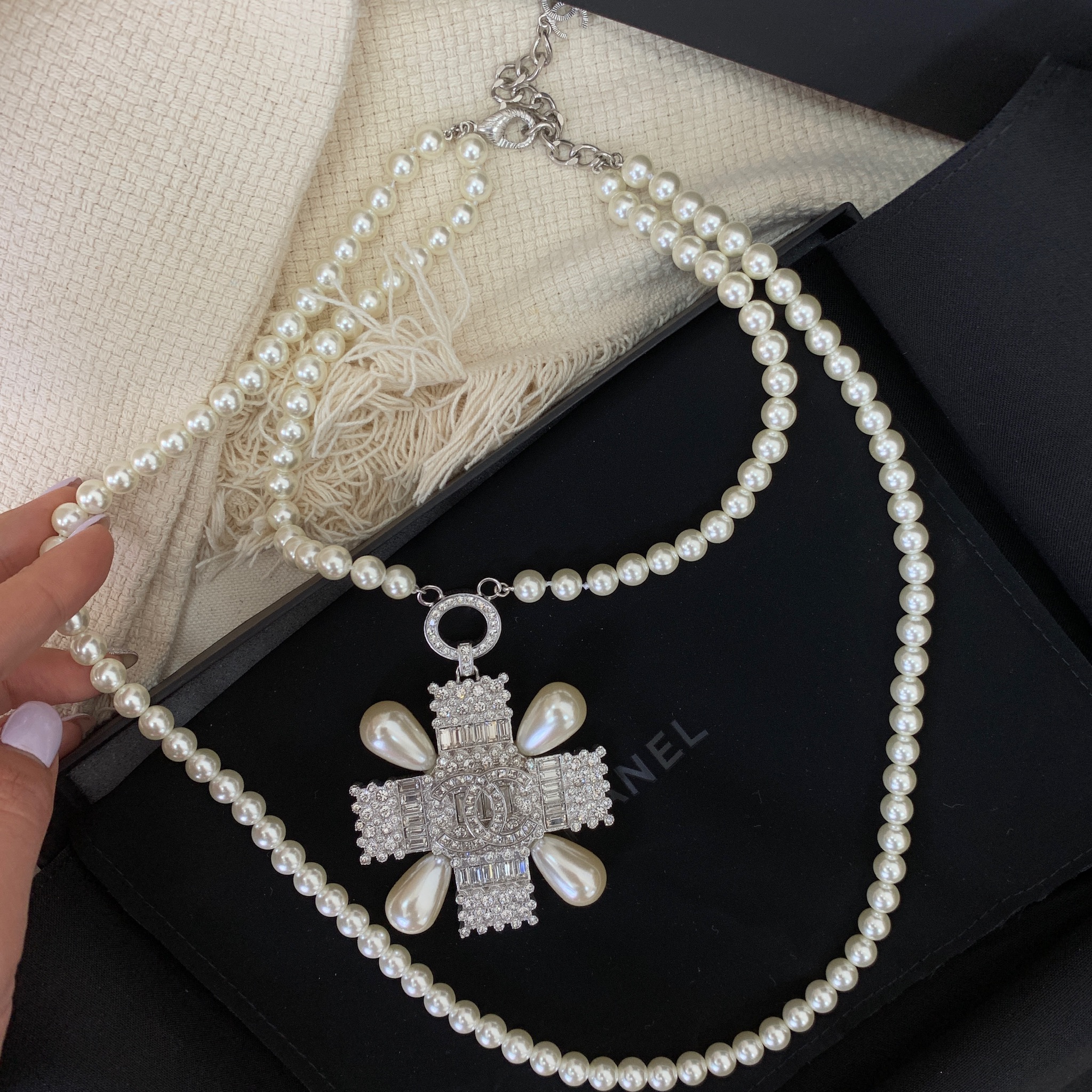 Элегантное колье Chanel LUX-15698 представляет собой изысканное украшение, выполненное в классическом стиле. Жемчужные бусины в сочетании с объемным крестообразным кулоном, инкрустированным кристаллами и украшенным жемчужными каплями, создают роскошный и узнаваемый образ, характерный для бренда Chanel. Это колье станет эффектным дополнением к вечернему наряду или элегантному повседневному образу.