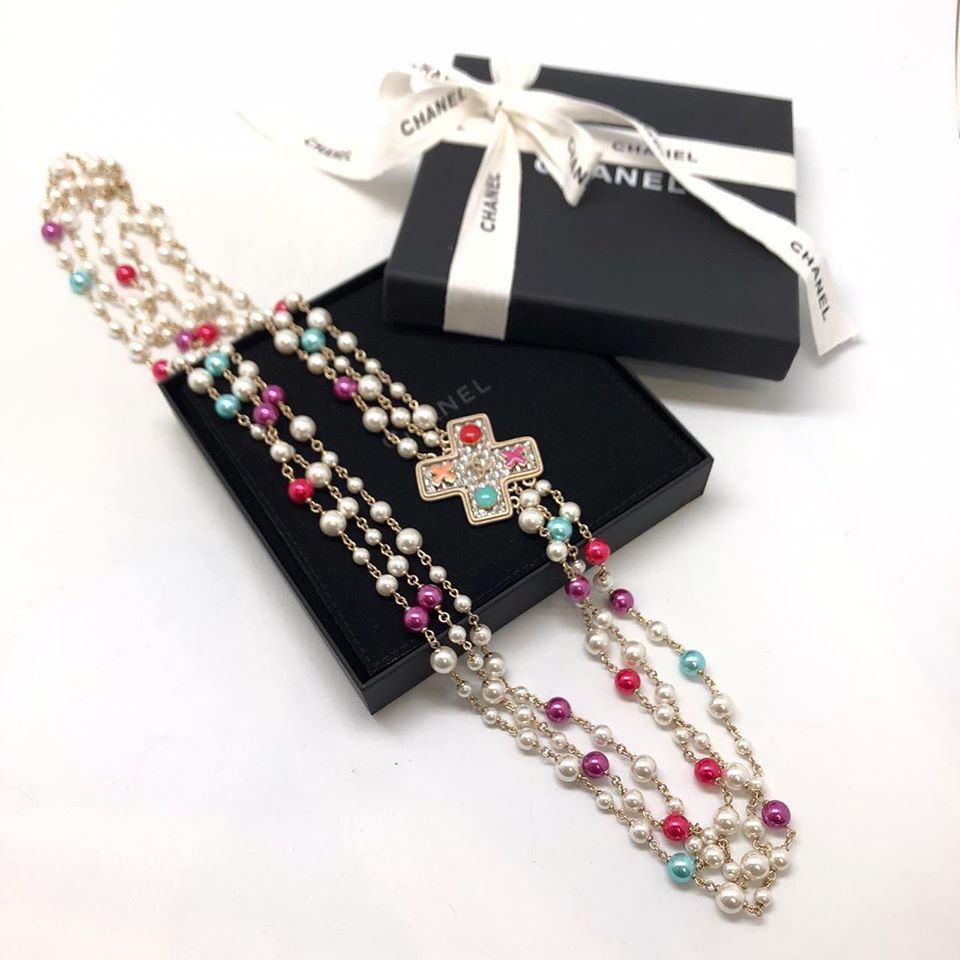 Колье Chanel LUX-27916 представляет собой многоярусное украшение, выполненное в элегантном и роскошном стиле, присущем бренду Chanel. Дизайн колье включает в себя нити из искусственного жемчуга кремового оттенка, дополненные бусинами ярких цветов – розового, голубого и сиреневого, создавая игривый и изысканный образ. Центральным элементом является кулон в форме креста, украшенный разноцветными камнями, что придает украшению особую привлекательность и шик.