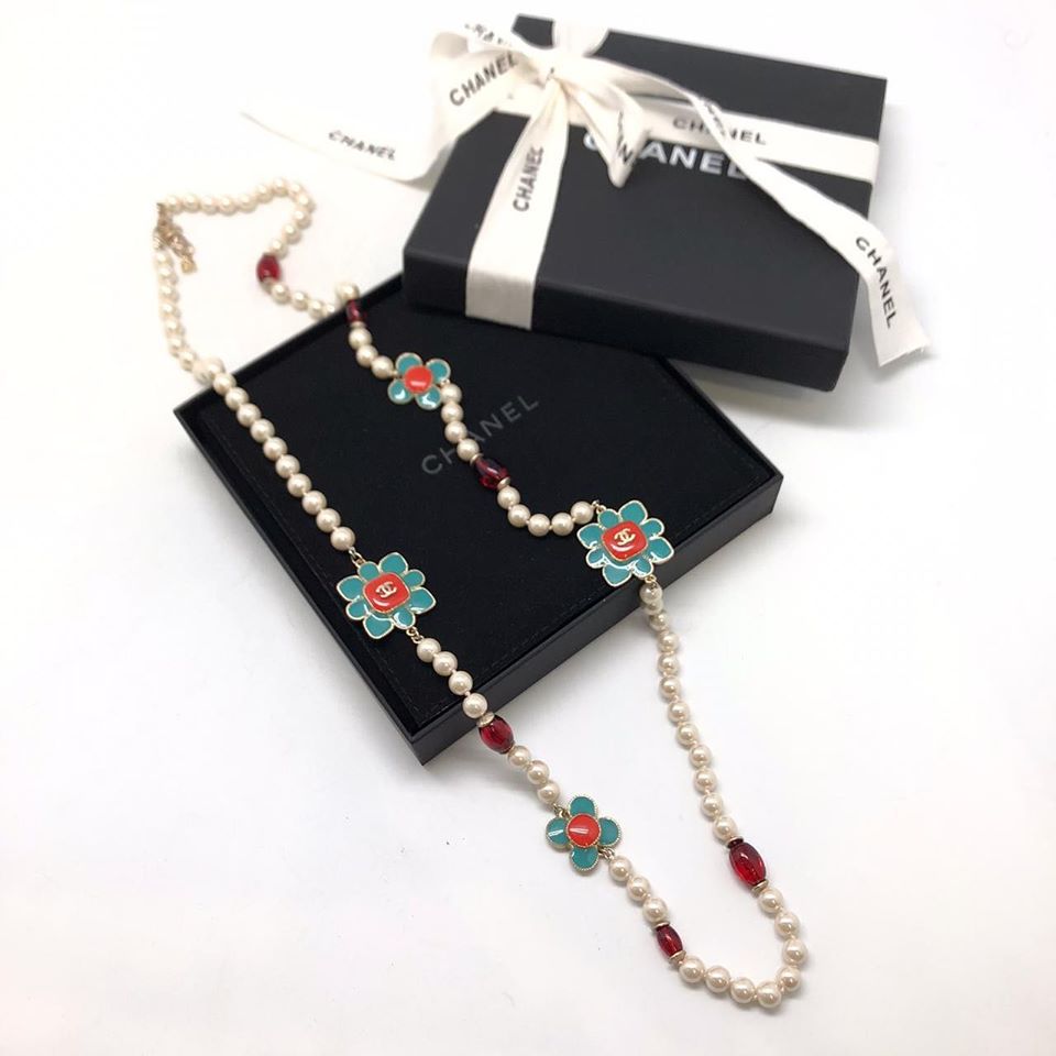 Это изысканное колье Chanel LUX-27920, выполненное в стиле бренда, станет ярким акцентом в любом образе. Длинная нить из жемчужных бусин дополнена оригинальными подвесками в виде бирюзовых цветов с красными вставками и узнаваемым логотипом Chanel, а также вставками из красных кристаллов.