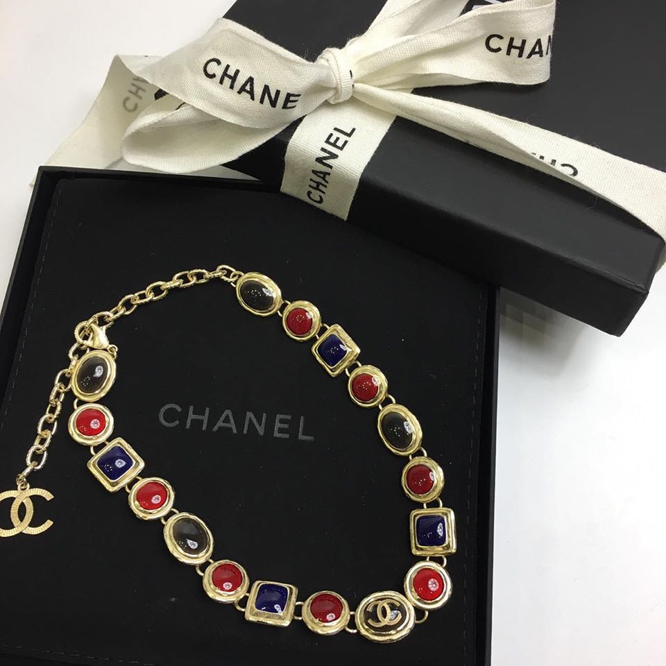 Это элегантное колье Chanel LUX-26401 представляет собой изысканное ювелирное изделие, сочетающее в себе классический стиль и современные дизайнерские решения. Украшение декорировано разноцветными вставками – красными, синими и черными, выполненными в форме кругов и квадратов, что придает ему особый шарм. Металлическая основа, выполненная в золотистом оттенке, гармонично дополняет цветовую палитру камней, а логотип бренда Chanel подчеркивает эксклюзивность изделия.