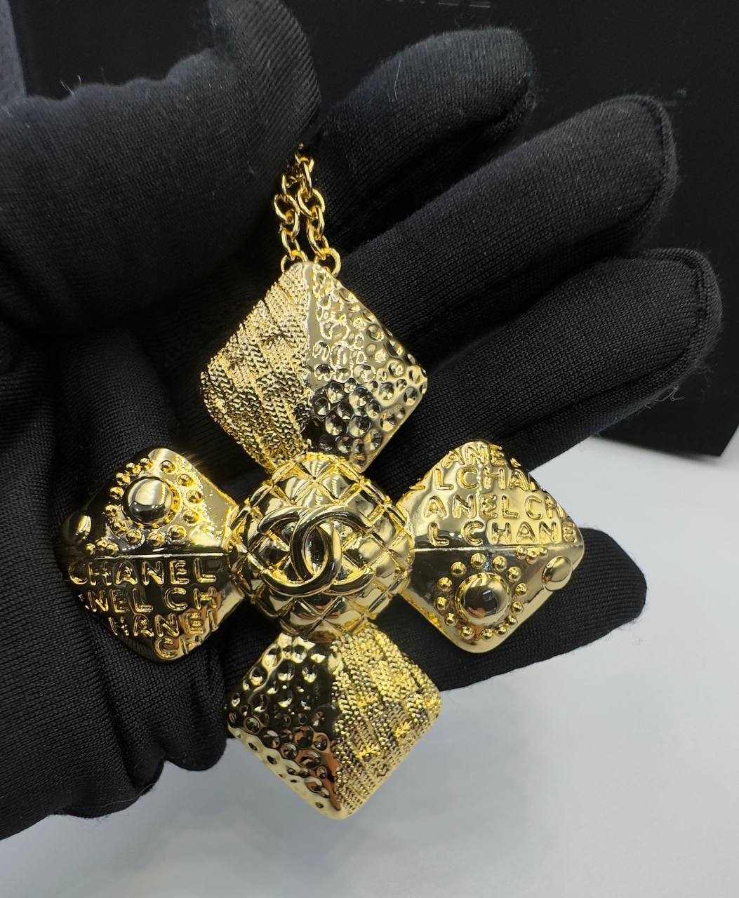 Колье Chanel LUX-112860 представляет собой изысканное украшение в фирменном стиле дома Chanel. Колье выполнено в золотистом оттенке, центральным элементом которого является декоративная подвеска в форме креста, с узором в виде фирменных логотипов. Оно идеально подойдет для добавления элегантности в любой образ.