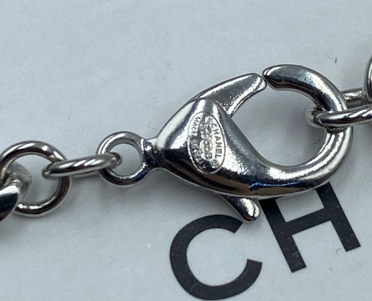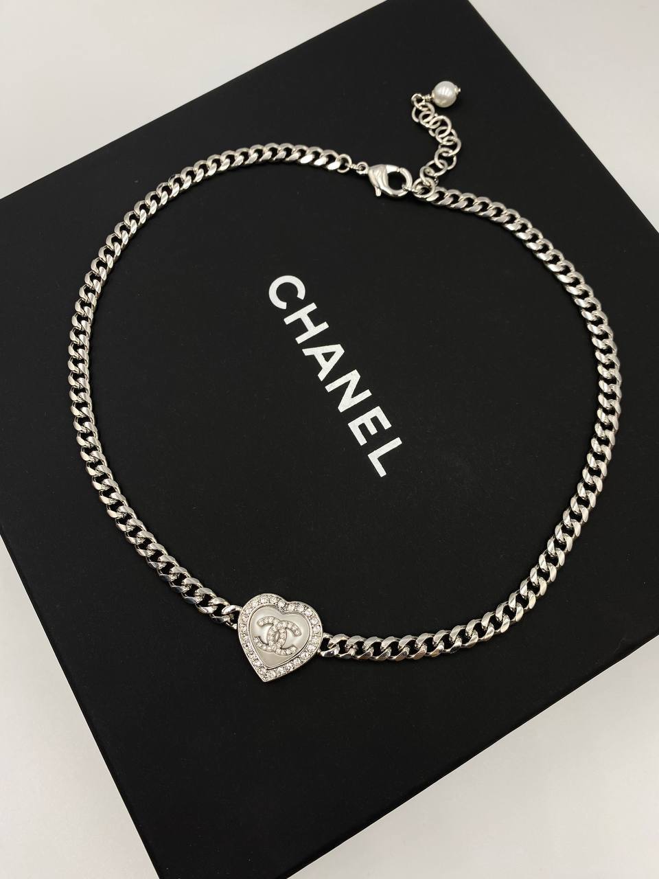 Колье-цепь 38-43 см Chanel LUX-98666 выполнено в узнаваемом стиле бренда, сочетая в себе элегантность и изысканность. Колье серебристого цвета с декоративной вставкой в форме сердца, украшенной логотипом Chanel и стразами, придаёт изделию роскошный вид. Этот аксессуар станет прекрасным дополнением к любому образу.