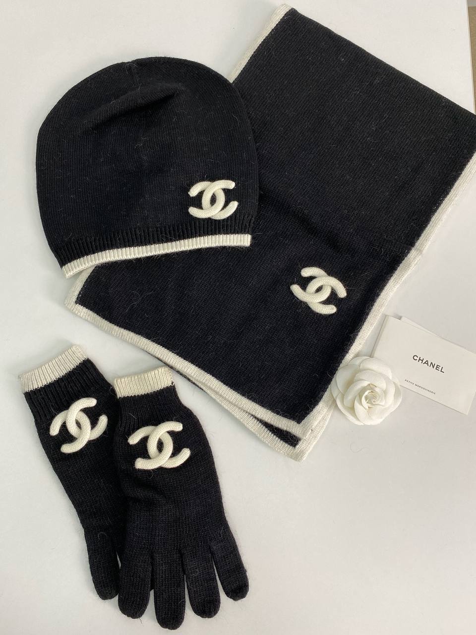 Комплект Chanel LUX-79501 представляет собой стильный зимний аксессуар. Комплект выполнен в классическом черном цвете с белыми деталями. В комплект входят шапка, шарф и перчатки, украшенные фирменным логотипом бренда.