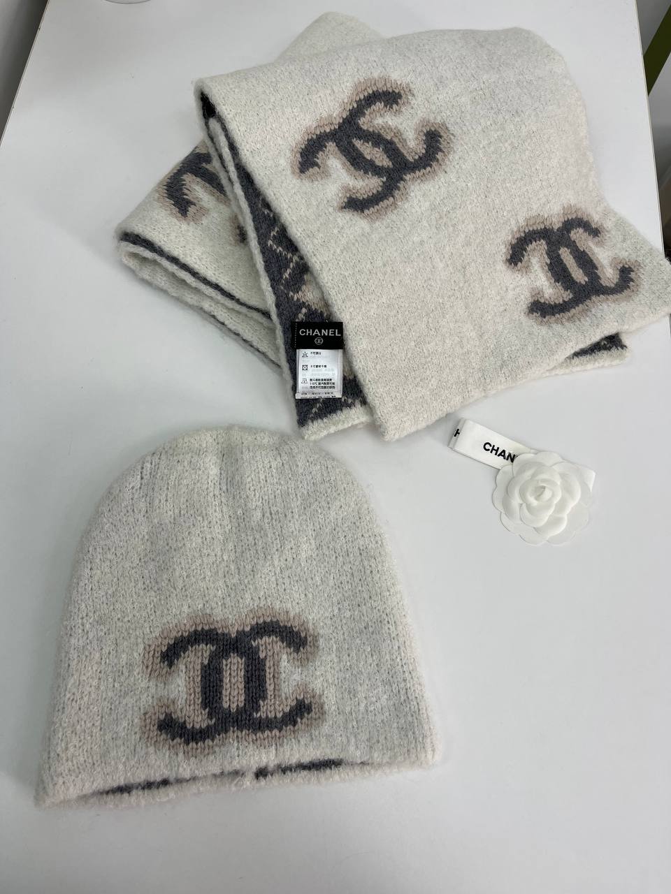 Комплект Chanel LUX-79585 — это стильный аксессуар, который подчеркнет ваш безупречный вкус. Комплект состоит из шапки и шарфа. Изделия выполнены в нейтральной цветовой гамме с узнаваемым логотипом бренда. Такой комплект станет отличным дополнением к любому образу в холодное время года.