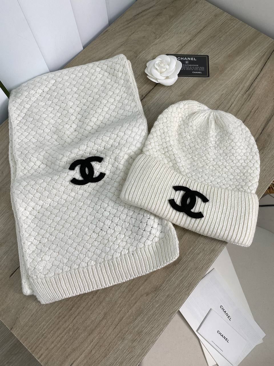 Комплект Chanel LUX-80032 – это стильный аксессуар, включающий в себя шапку и шарф. Комплект выполнен в белом цвете и декорирован вышитым логотипом бренда. Такой комплект станет отличным дополнением к повседневному образу, добавив элегантности и тепла в холодное время года.