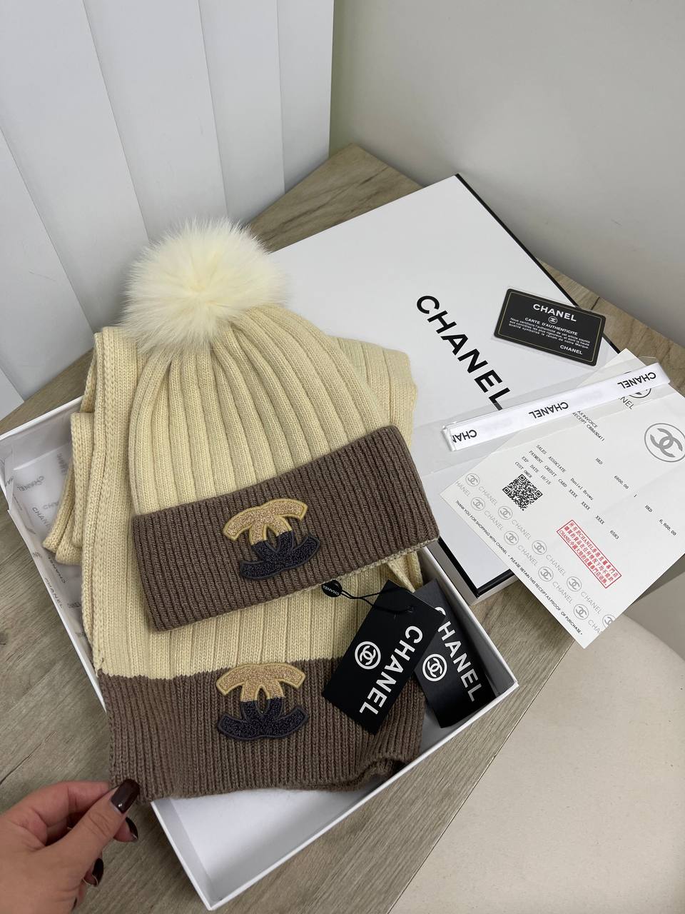 Комплект Chanel LUX-80702 – это стильный аксессуар, который подчеркнет ваш безупречный вкус. Комплект выполнен в кремово-коричневых тонах с классическим логотипом бренда. Этот комплект идеально подойдет для создания элегантного и теплого образа в холодное время года.