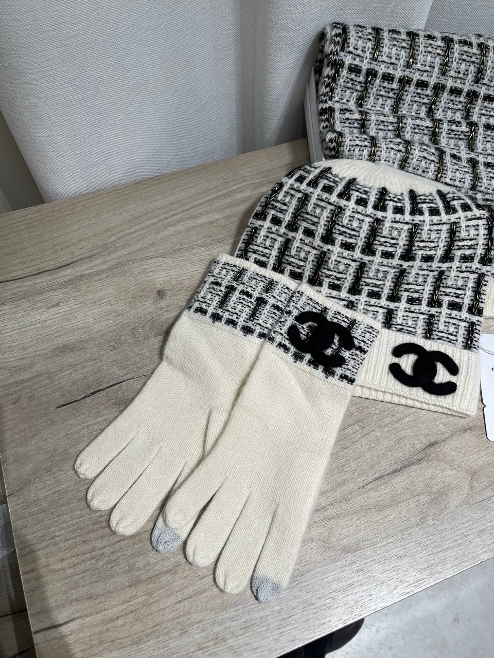 Комплект Chanel LUX-128655 - элегантный и стильный набор, который подчеркнет ваш изысканный вкус. В комплект входят шапка, шарф и перчатки, выполненные в едином дизайне. Этот аксессуар станет прекрасным дополнением к вашему гардеробу.