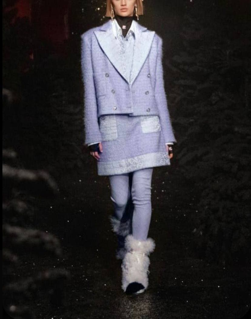 Этот костюм Chanel LUX-60729 представляет собой элегантный комплект, состоящий из приталенного жакета и юбки. Модель выполнена в нежном светло-сиреневом оттенке, что придает образу утонченность. Дизайн сочетает в себе классические элементы с современными акцентами, делая этот костюм подходящим для различных мероприятий, от деловых встреч до вечерних выходов.