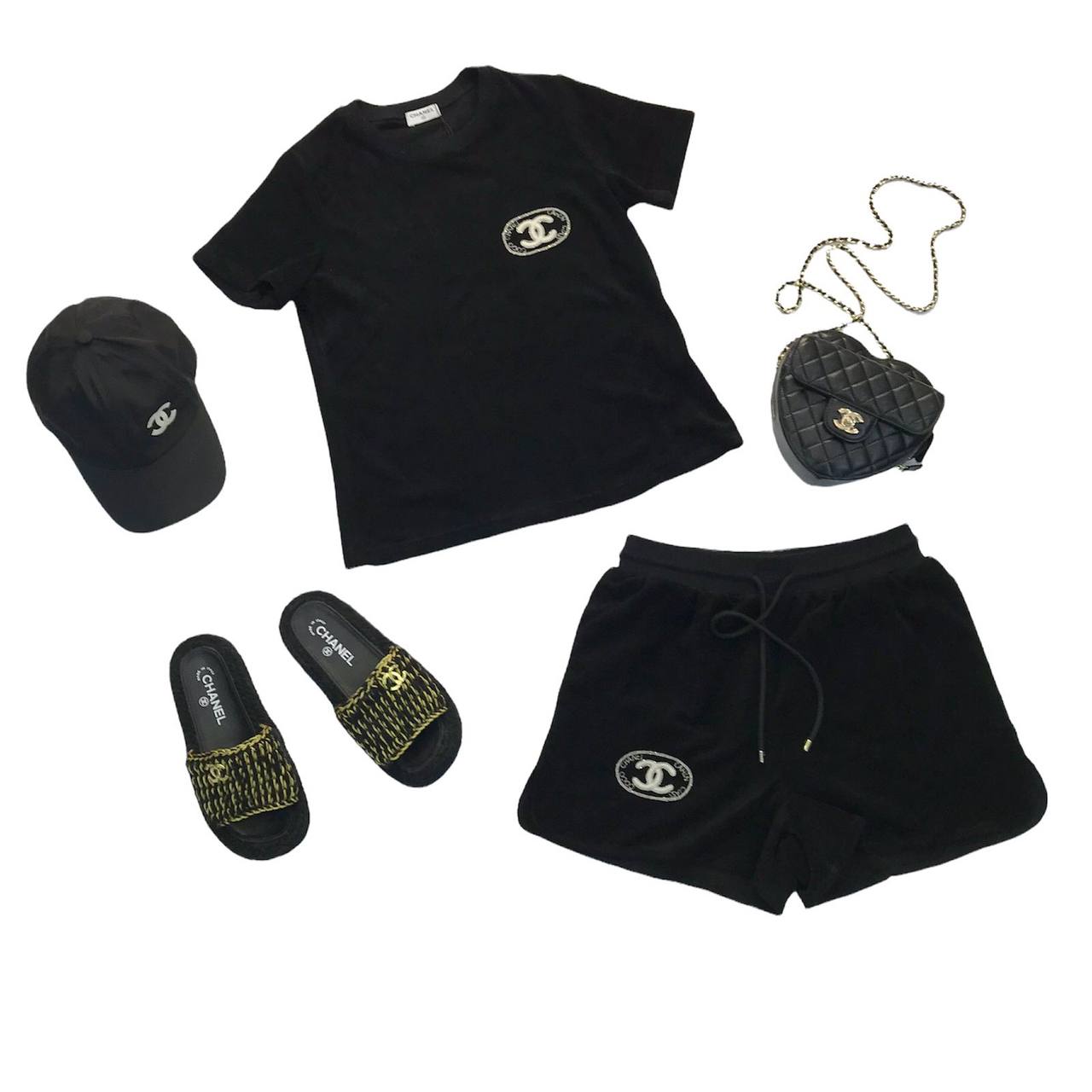 Костюм Chanel LUX-68909 представляет собой элегантный и стильный комплект, идеально подходящий для создания модного образа. Набор включает черную футболку с фирменным логотипом, черные шорты, черную кепку и черные шлепанцы, а также черную сумку в форме сердца. Этот комплект отличается лаконичным дизайном и высоким качеством исполнения.