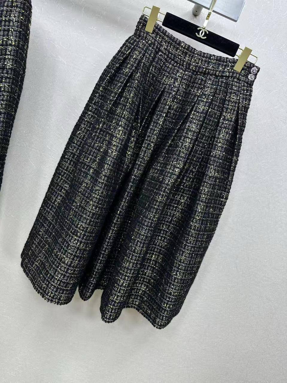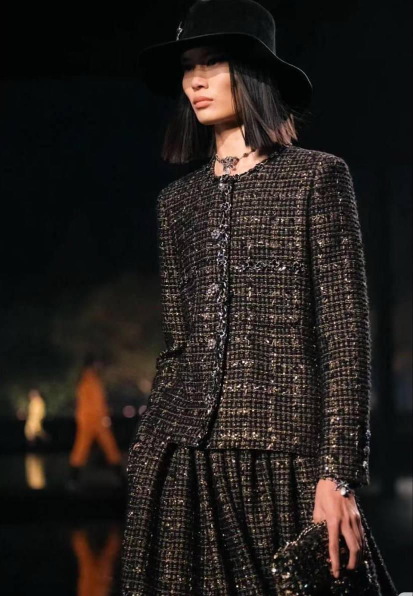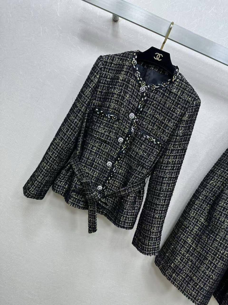 Элегантный костюм Chanel, состоящий из жакета с поясом и юбки, выполнен в классическом стиле и отличается изысканным дизайном. Такой костюм станет отличным выбором для создания стильного и запоминающегося образа.
