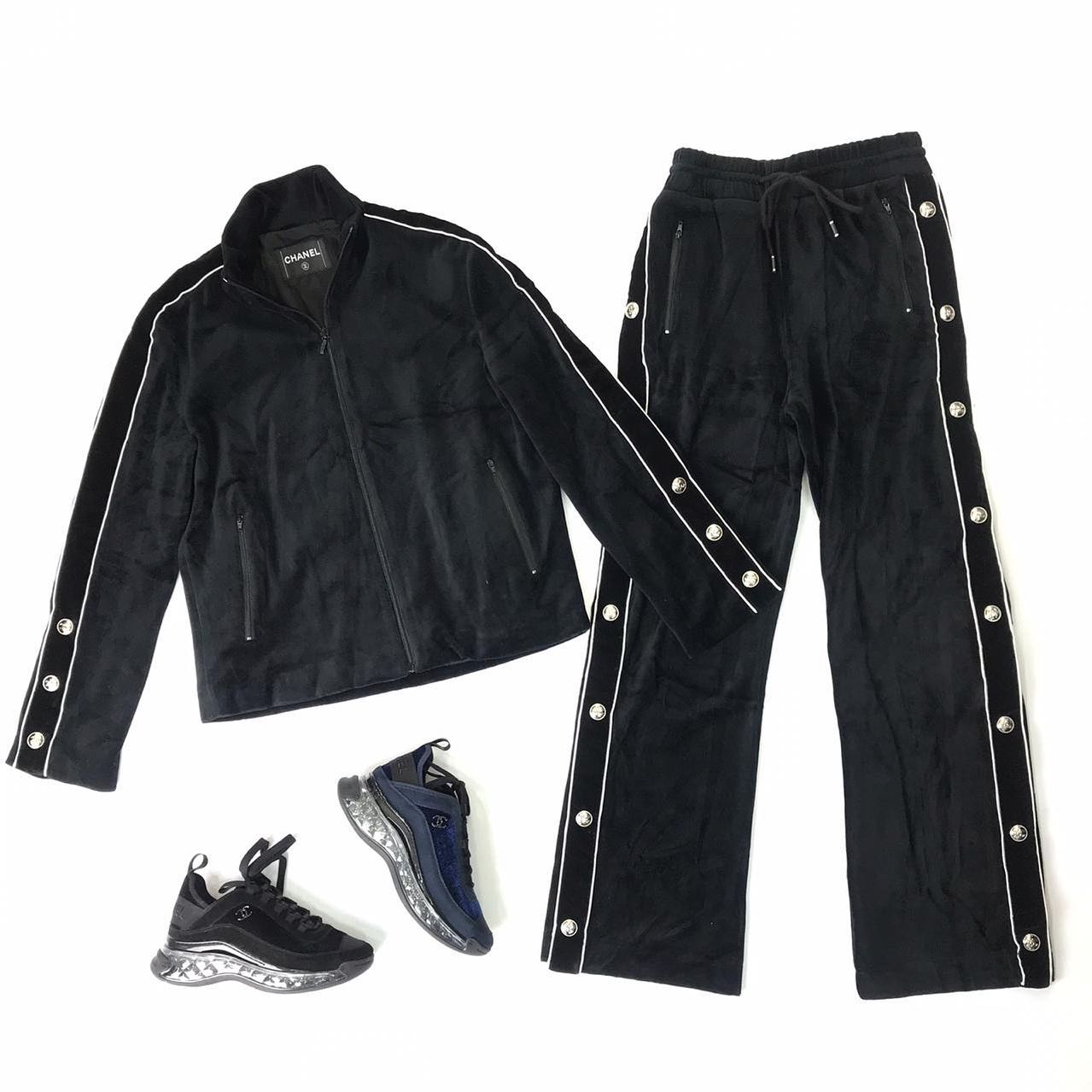 Костюм спортивный Chanel LUX-39884 представляет собой элегантный спортивный костюм, выполненный в классическом черном цвете. Модель сочетает в себе удобство спортивной одежды и изысканный стиль бренда Chanel, что делает его идеальным выбором для создания модных повседневных образов.