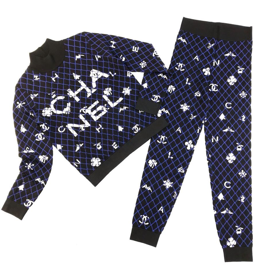 Спортивный костюм женский Chanel LUX-19967 представляет собой стильный и удобный комплект, выполненный в современном дизайне. Комбинированный принт с крупным логотипом бренда "CHANEL" и мелкими узнаваемыми символами, такими как цветок и буква "C", в сочетании с геометрической сеткой, создает эффектный образ.