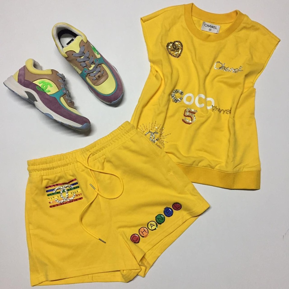 Женский костюм Chanel LUX-14171 представлен в ярком желтом цвете. Комплект состоит из футболки с короткими рукавами и шорт, оба элемента украшены узнаваемым логотипом бренда и декоративными элементами. Этот стильный костюм идеально подойдет для создания расслабленных, но при этом модных образов в стиле casual.