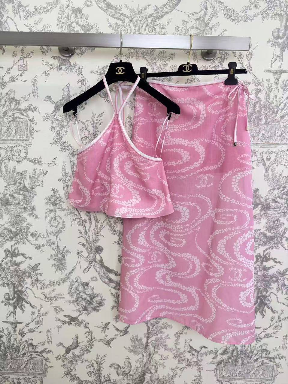 Костюм женский Chanel LUX-119665, представленный на изображении, выполнен в ярком розовом цвете с белым узором. Этот летний костюм включает в себя топ на тонких бретелях и юбку с завязками, выполненные в едином стиле. Он сочетает в себе элегантность и легкость, идеально подходя для летнего гардероба.