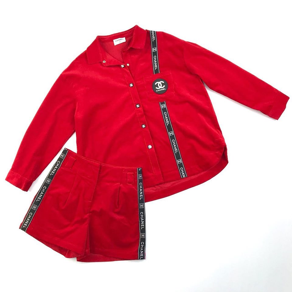 Этот женский костюм Chanel LUX-19672 представляет собой элегантный комплект, состоящий из рубашки и шорт, выполненный в ярком красном цвете. Стиль костюма подчеркнут контрастными лентами с логотипом бренда, расположенными вдоль застежки рубашки и по бокам шорт. Такой дизайн придает изделию узнаваемость и роскошный вид, идеально подходящий для создания эффектных образов.