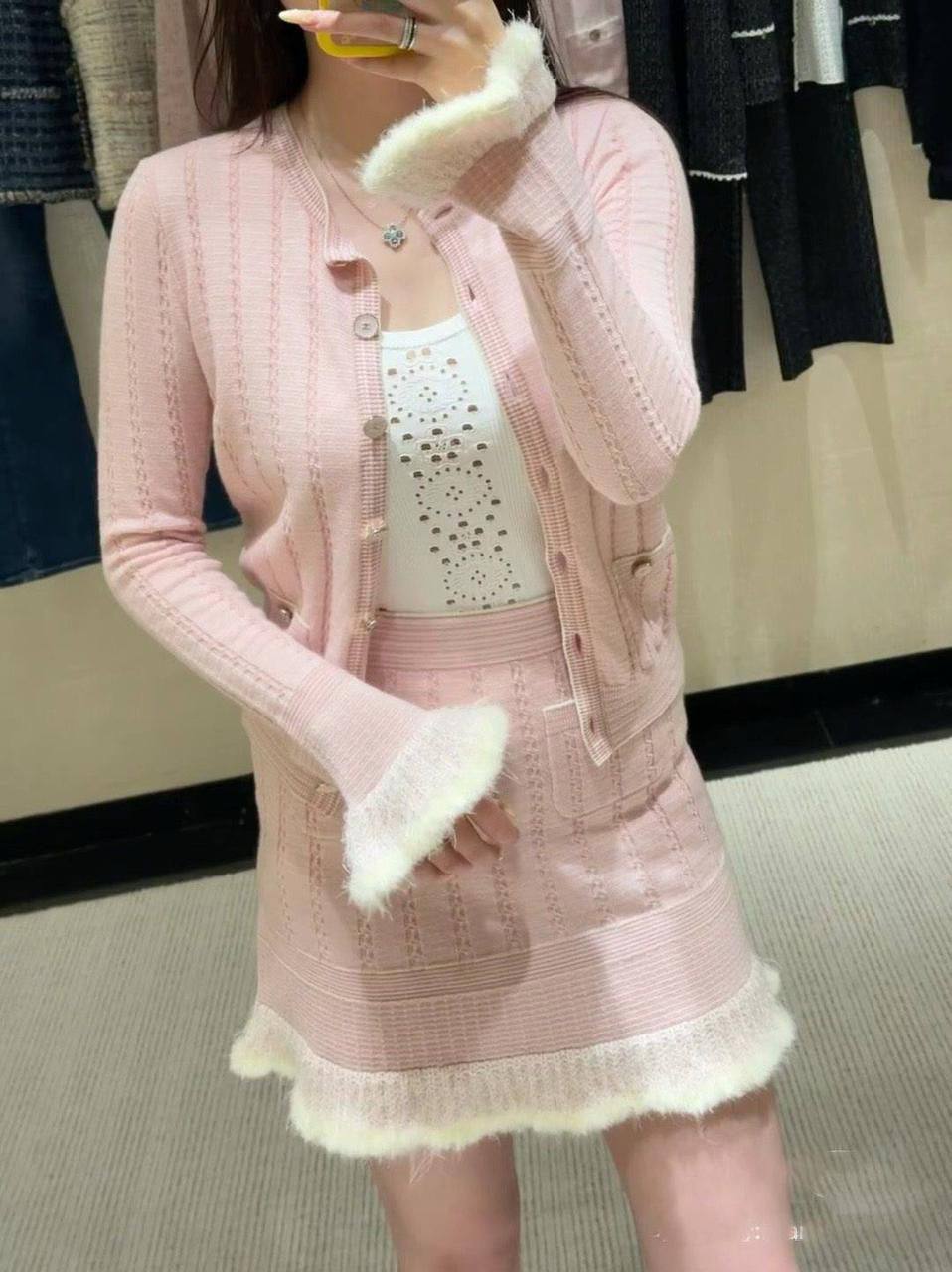 Chanel женский костюм LUX-125442 – элегантный и стильный комплект, состоящий из кардигана и юбки. Выполненный в нежном розовом оттенке, этот костюм добавит образу женственности и изысканности.